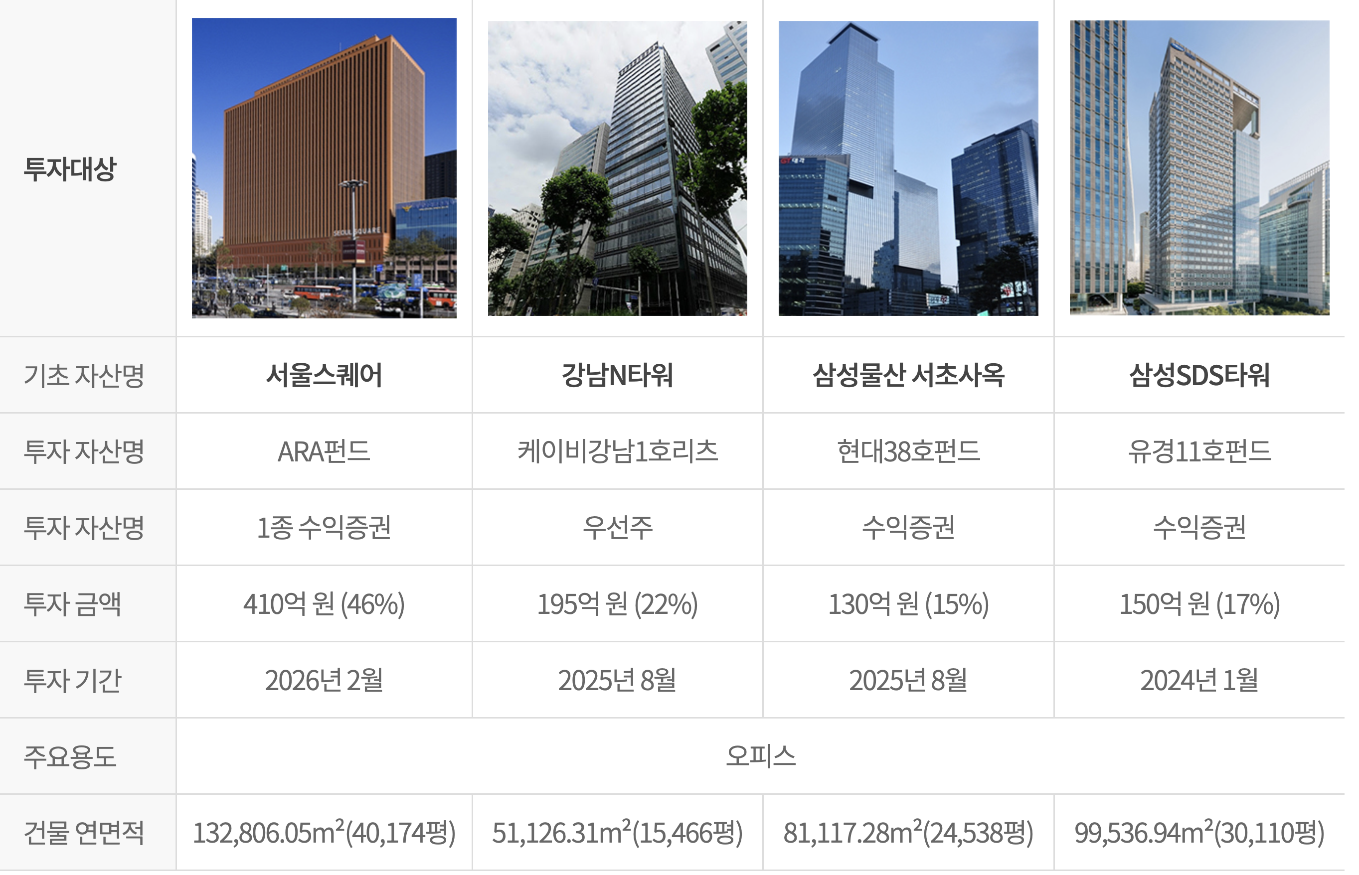 ⊙ 그리고 현재 'NH프라임리츠'는 아래와 같이 '4개의 자산(오피스)'에 지분 투자하고, 그 분배금을 주주들에게 배당금의 형태로 돌려주고 있습니다.