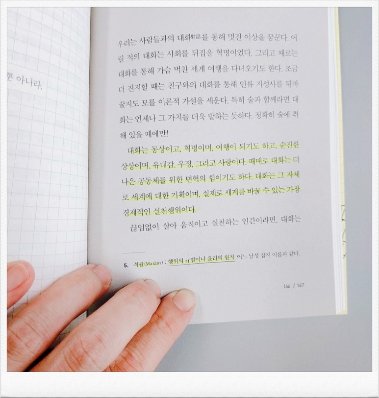 [대화는 몽상이고, 혁명이며, 여행이 되기도 하고, 순진한 상상이며, 유대감, 우정, 그리고 사랑이다.] 그리고 [대화는 그 자체로 세계에 대한 기획이며, 실제로 세계를 바꿀 수 있는 가장 경제적인 실천행위이다.]