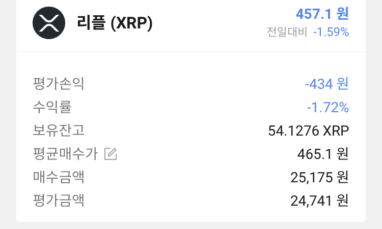 - 그리고 회원가입 축하금, 이벤트 캐시에 추가적으로 원화 입금을 통해 평소 관심 있던 가상화폐인 '리플'을 54개 정도 매수해보았습니다.
