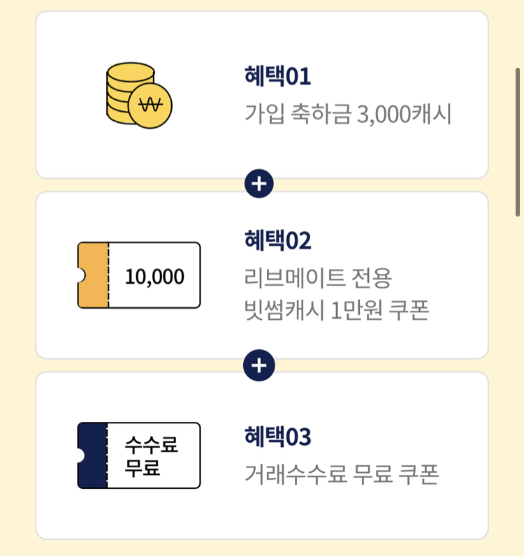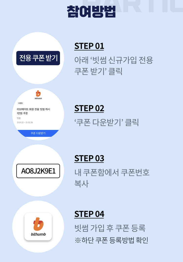 간단하게 정리해보면, '리브메이트 회원 가입 후 쿠폰 발급' ☞ '빗썸 회원 가입' ☞ '빗썸 이벤트 쿠폰 등록 절차'를 진행하면, 회원가입 후 즉시 '13,000원의 이벤트 캐시(가입 축하금 포함)'를 받을 수 있습니다.