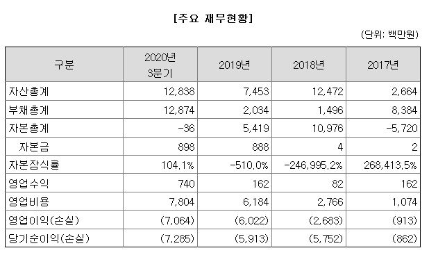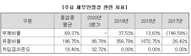 - 또한, 재무안정성을 살펴보면, 2020. 3분기 기준 자본잠식 상태이며, 업종 평균 대비 낮은 유동 비율, 높은 차입금의존도를 보여주고 있습니다.
