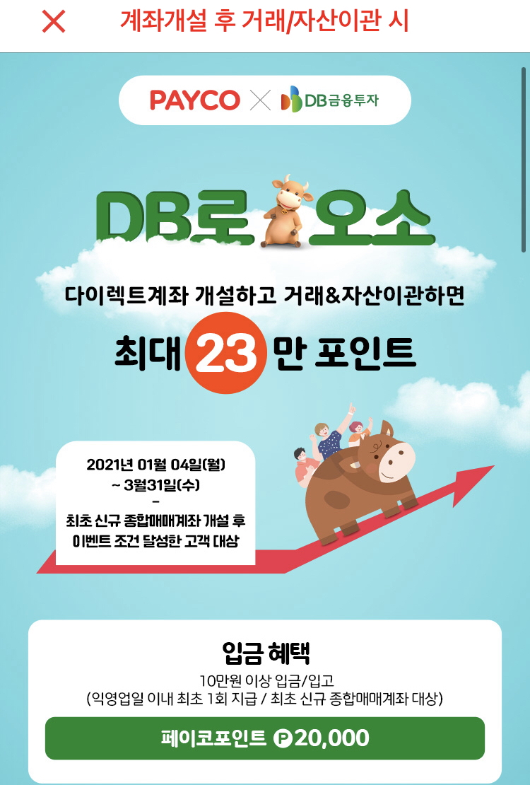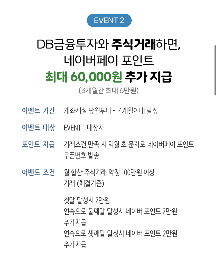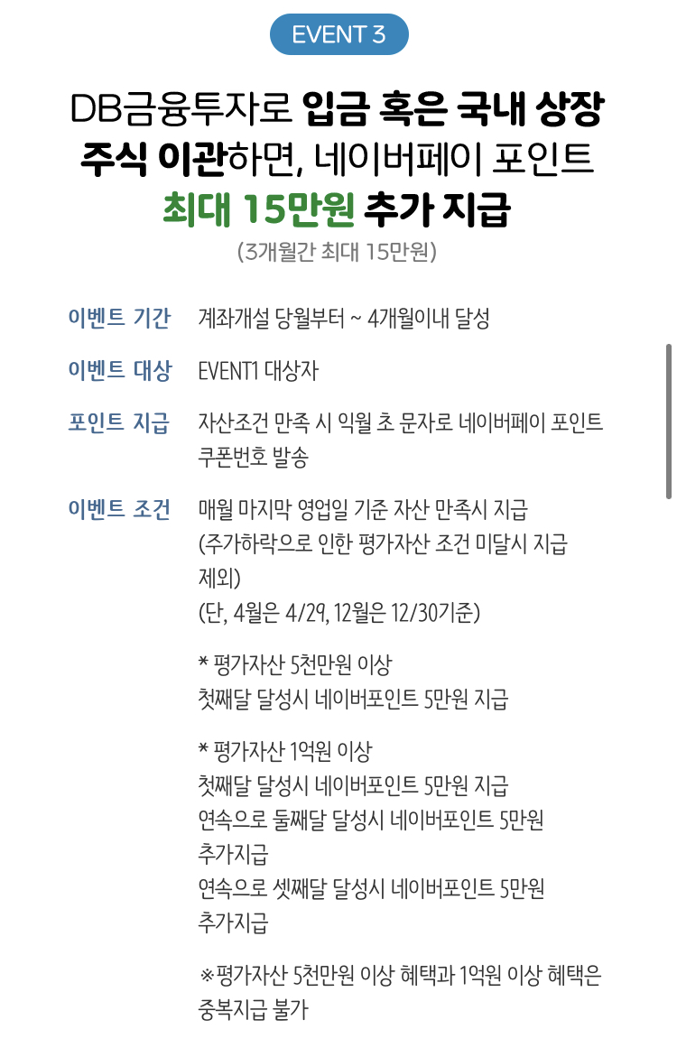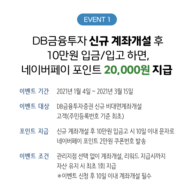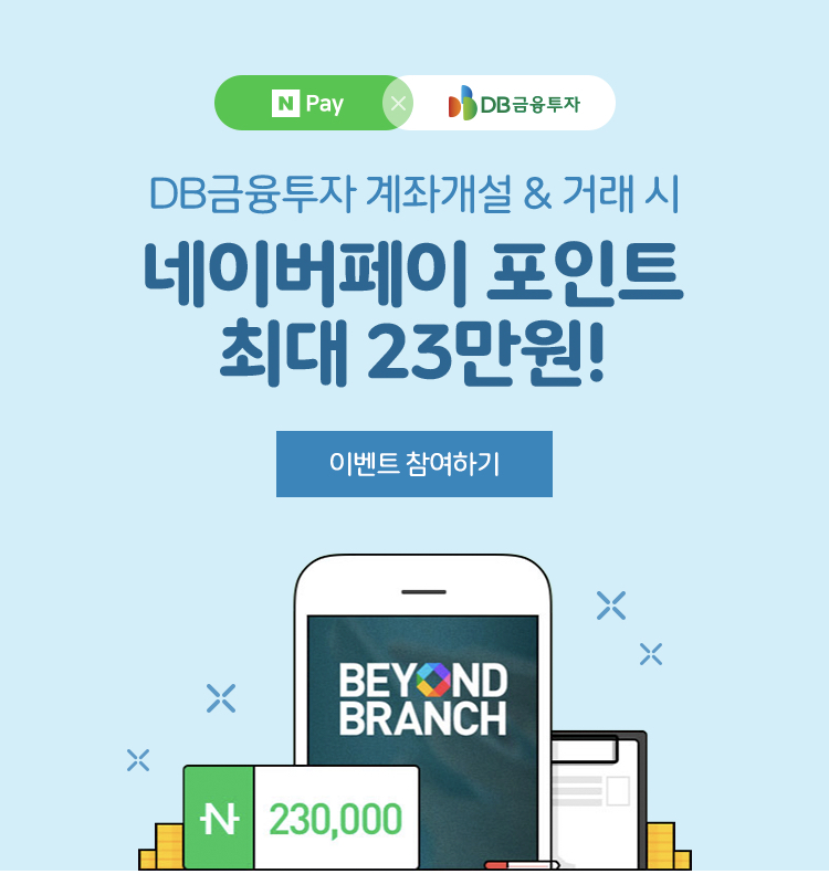 - 다만, 아쉽게도 (활용성이 상대적으로 큰) '네이버페이'의 경우는 지난 3. 15. 까지 이벤트를 진행(현재는 종료)했습니다. 따라서, ‘DB투자증권’ 계좌를 개설하려고 하시는 분들이라면, ‘페이코’나 ‘카카오페이’에서 이벤트 신청 후 계좌를 개설하시면 혜택을 받을 수 있습니다.