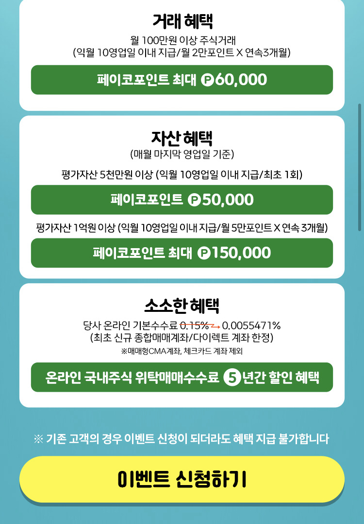 - 혜택 4) 평가자산 1억 원 이상 -> 150,000 페이코 포인트 지급