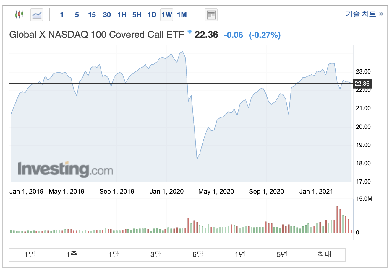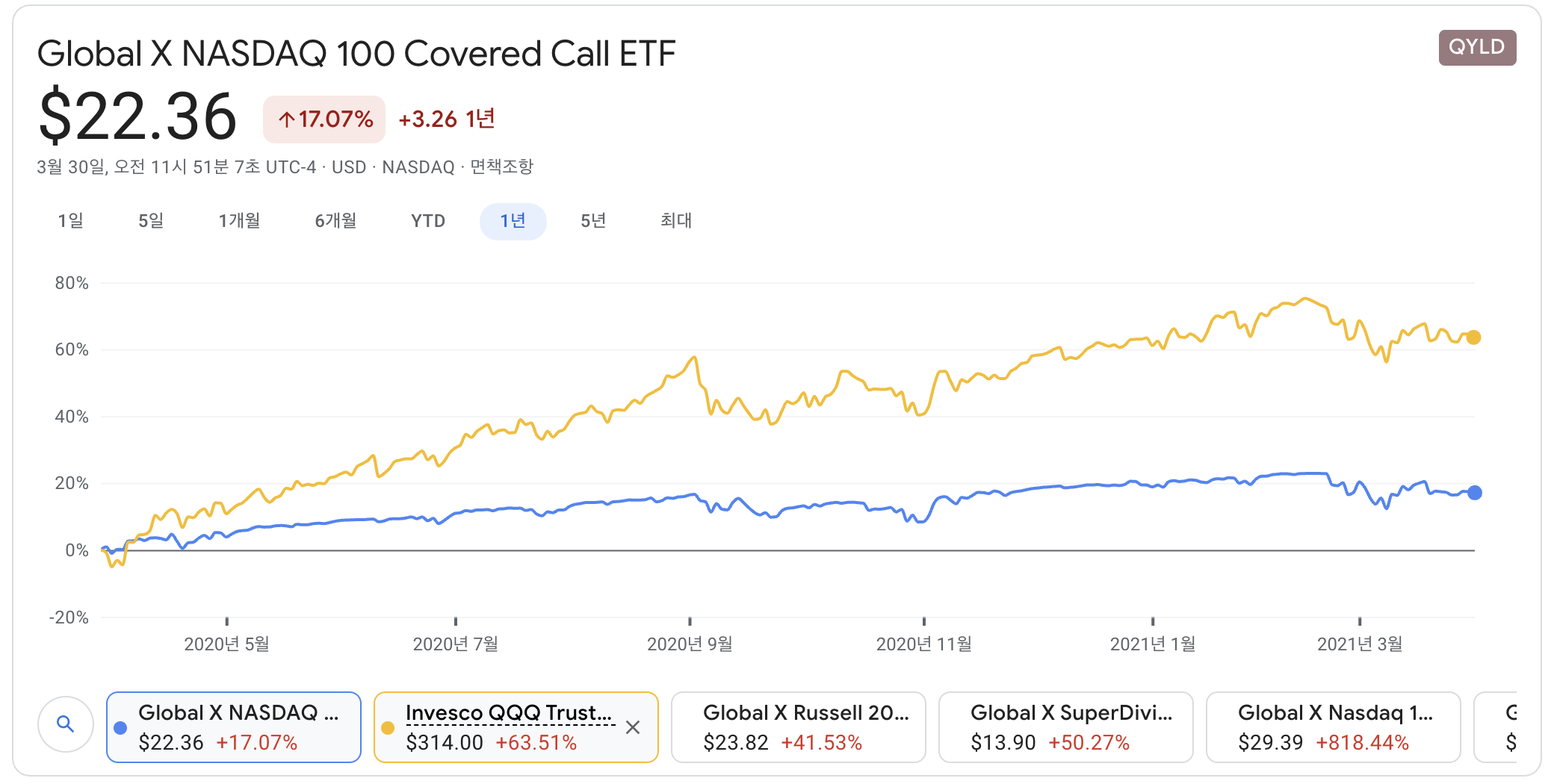 - 코로나 19 이후 점진적으로 주가가 회복되고 있는 다른 ETF와 비교해보면, “QYLD” 의 주가상승이 힘든 것을 확인할 수 있습니다.