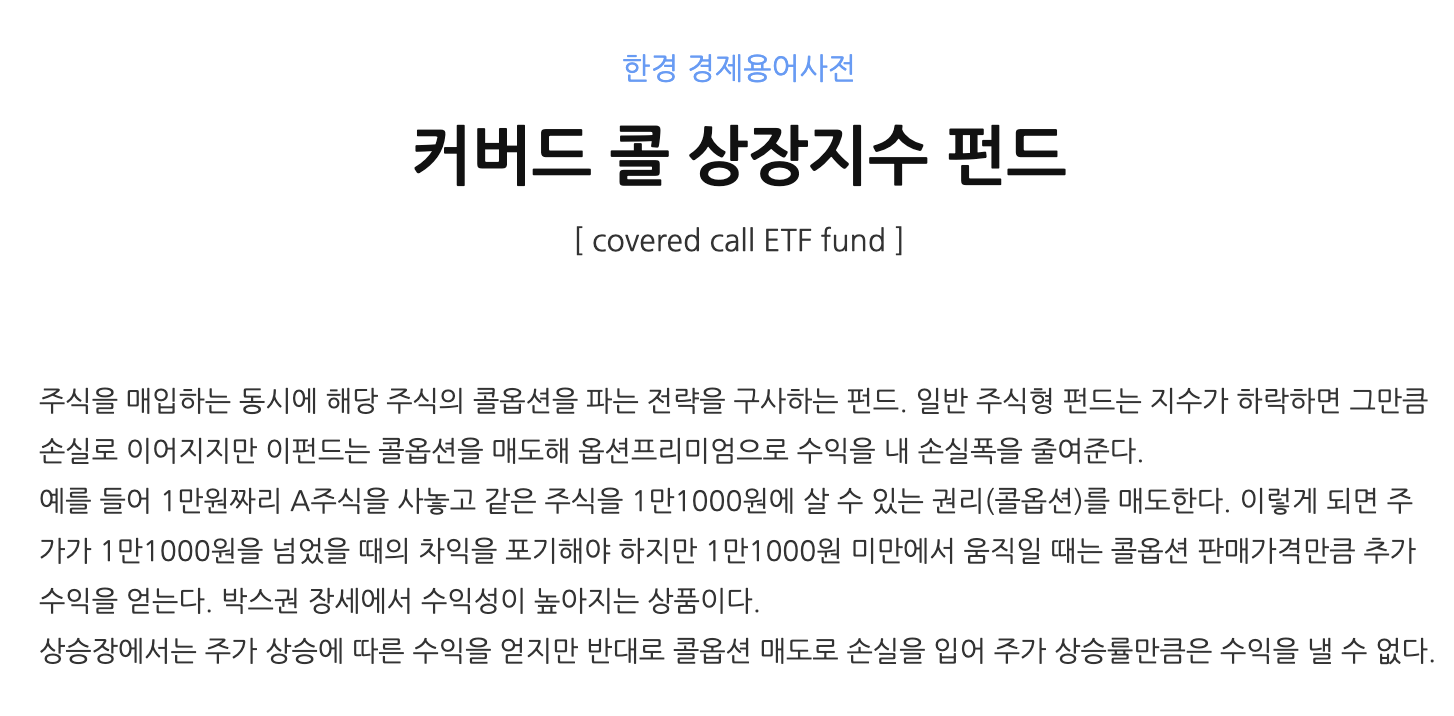 - “커버드 콜” 로 인해 상승장에서는 콜옵션 매도로 손실을 입게 되어 주가 상승률만큼 수익을 얻기 힘든 구조로 되어있습니다.