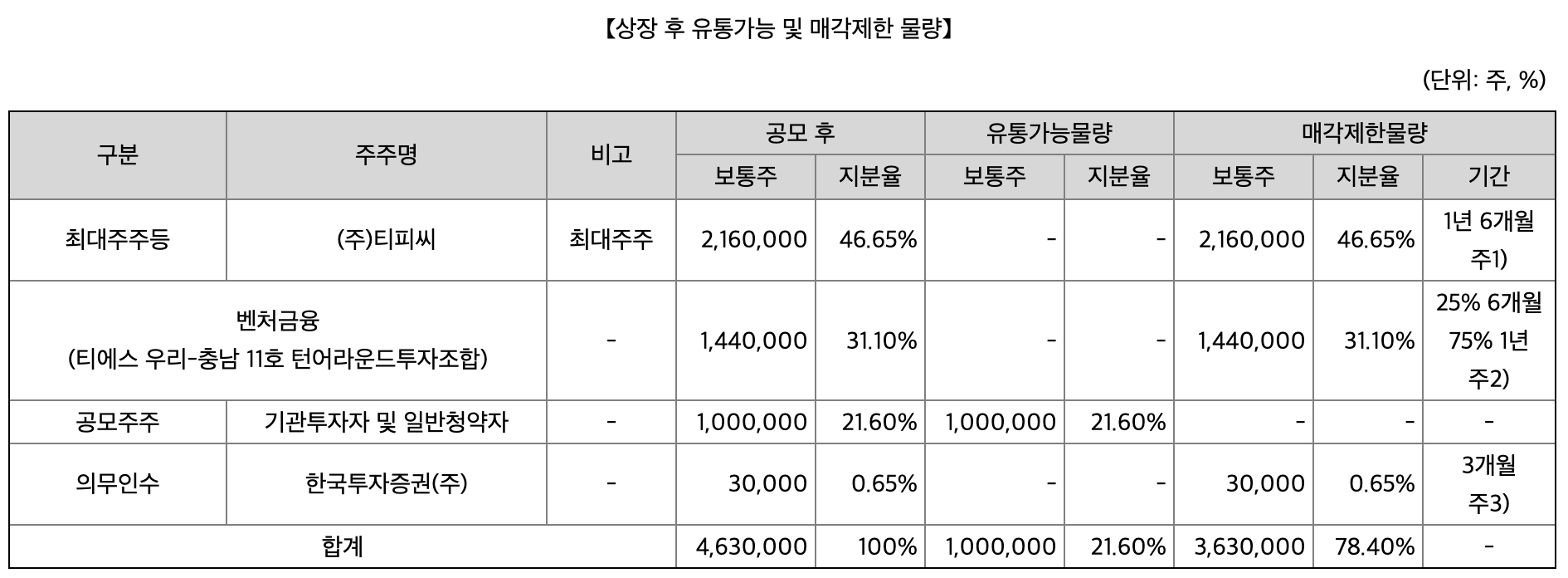 ⊙ 상장 직후 21.60%(1,000,000주, 기관투자자 및 일반청약자 지분)가 유통 가능하며, 대규모 매도 등으로 인해 상장 후 주가가 하락하는 등 부정적 영향을 미칠 수 있습니다.