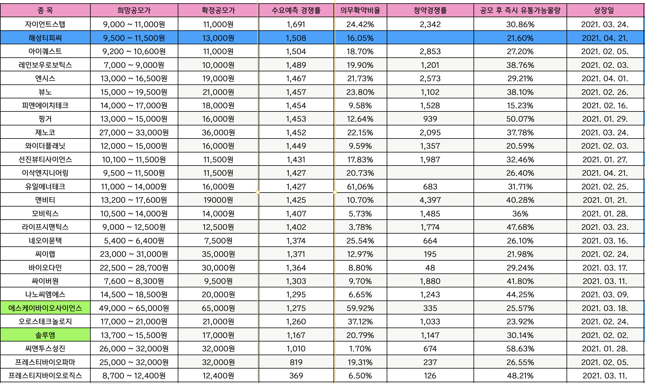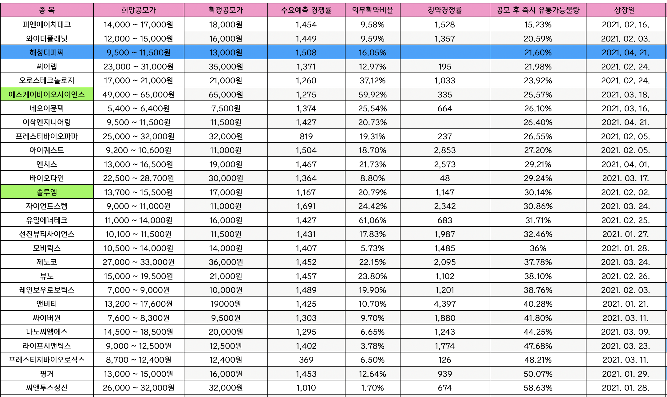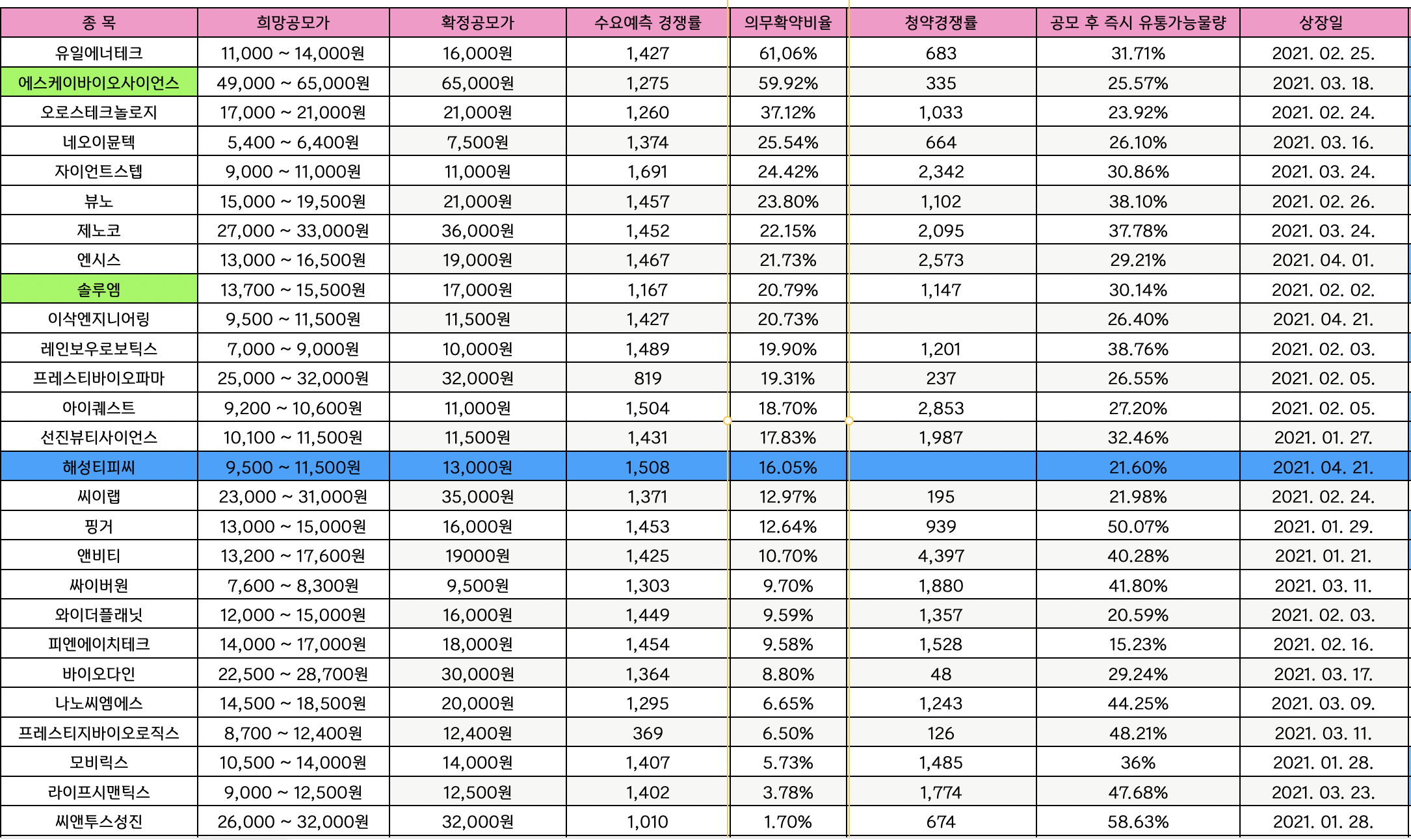⊙ 공모주 '시초가' 등에 많은 영향을 미칠 수 있는 '해성티피씨'의 수요예측 경쟁률, 의무 확약 비율, 상장 직후 유통가능 물량 등이 전반적으로 좋아 보입니다.