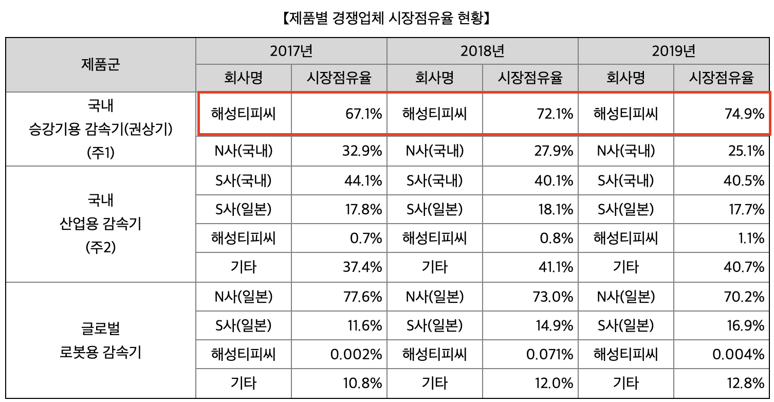 ⊙ '해성티피씨'의 국내 승강기용 감속기의 시장 점유율은 74.9%(2019년 기준)으로 국내 시장을 선도하는 위치에 있습니다.