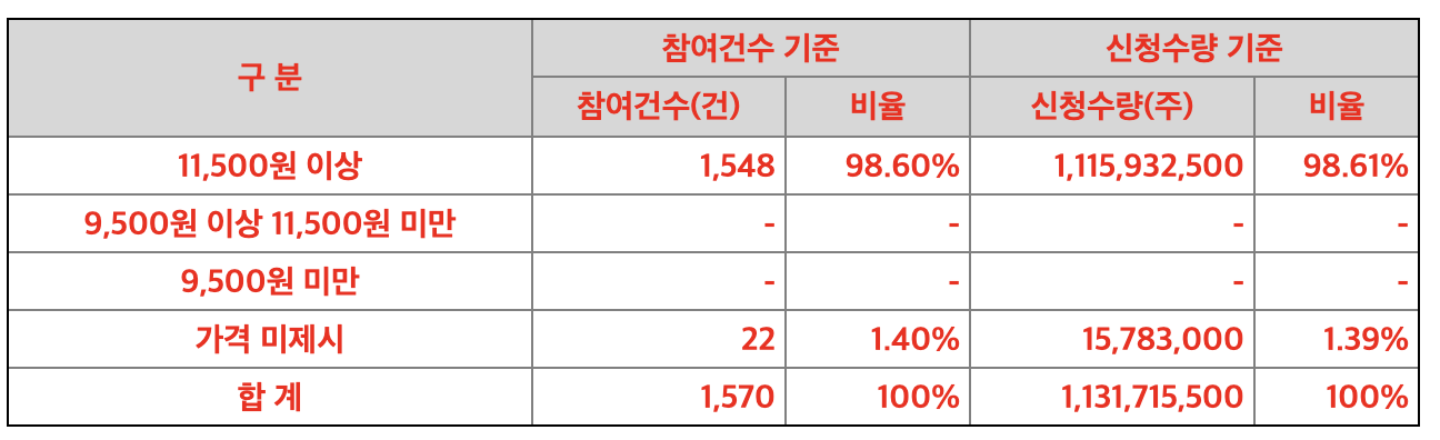 ⊙ 공모 희망가액 밴드가 9,500원 ~ 11,500원이었는데, 밴드 최상단 이상을 신청한 비율이 98.61%라는 매우 좋은 결과를 보여 주었습니다.