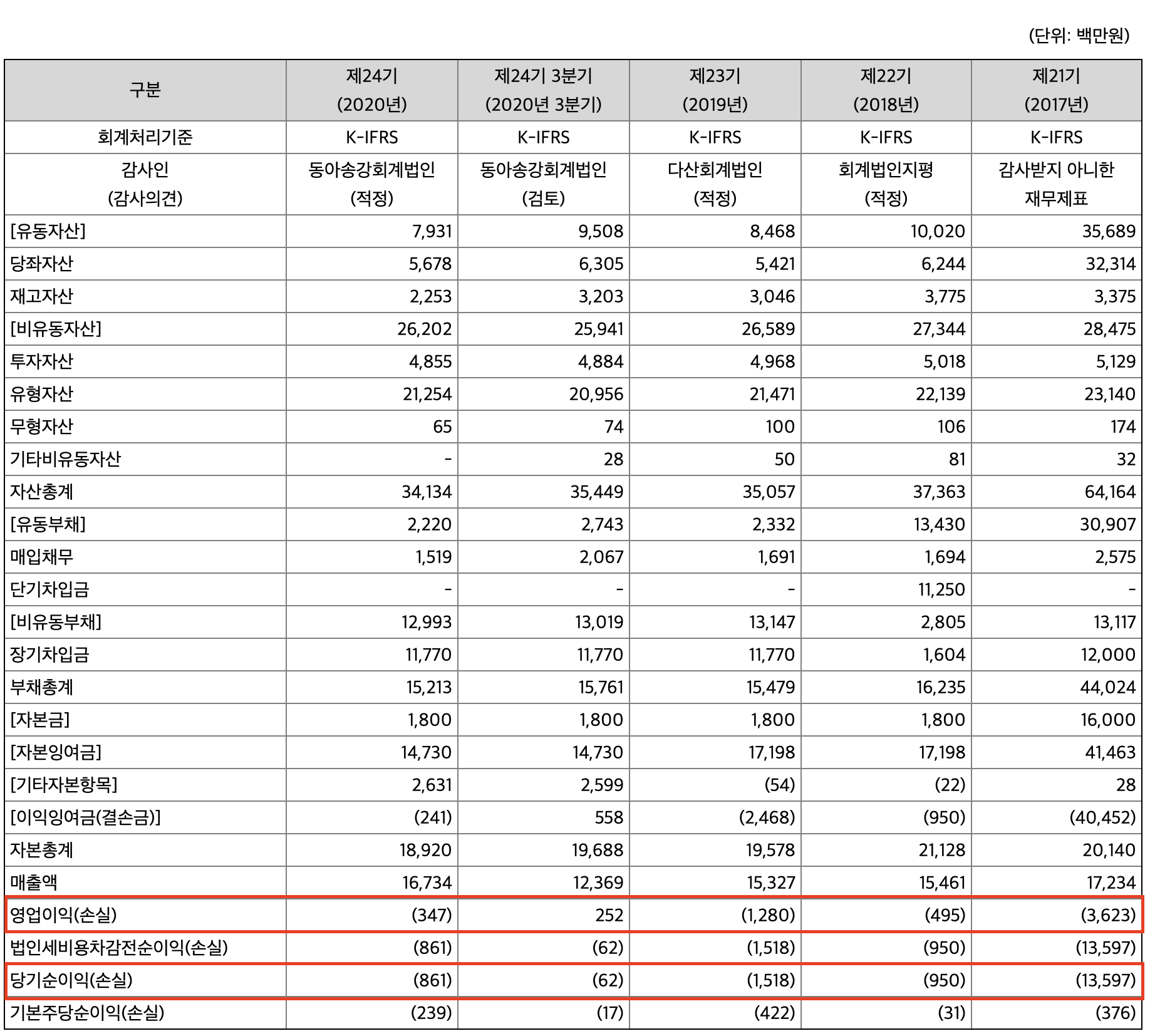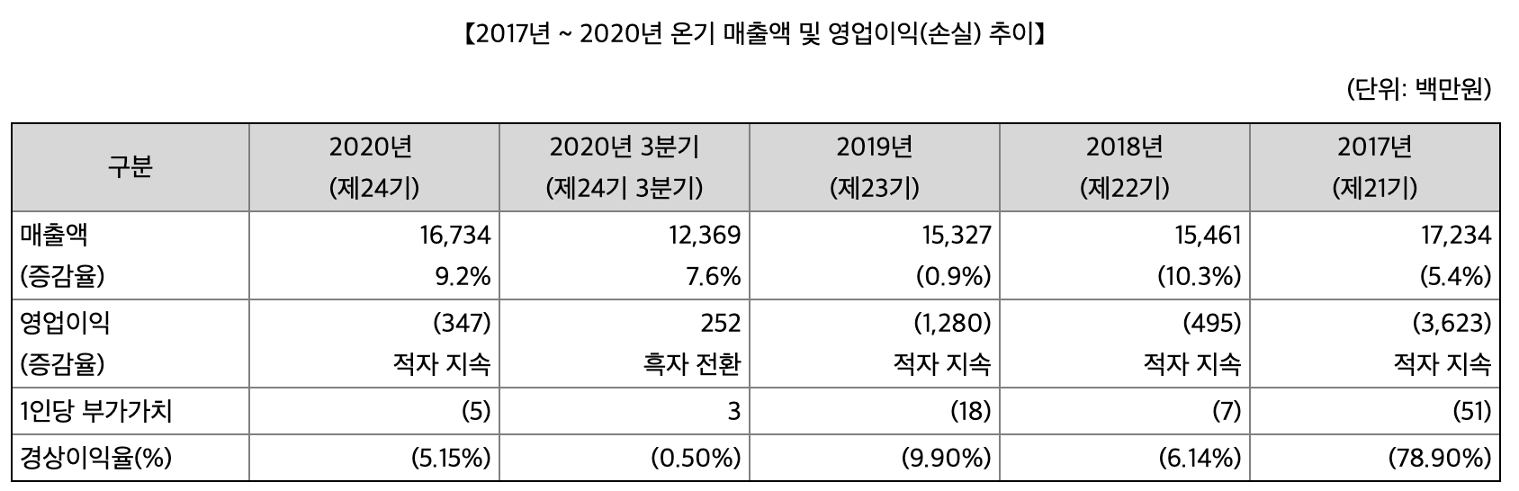 2) 2020년을 제외하고 최근 3년간 계속해서 매출액이 감소하고 있으며, 지속적으로 적자가 발생하고 있습니다.