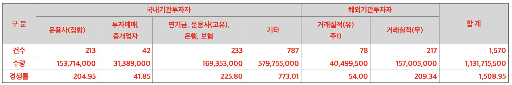 ⊙ 기관투자자의 수요예측 경쟁률은 1,508대 1로 '매우 좋은 결과'를 보여주었습니다.