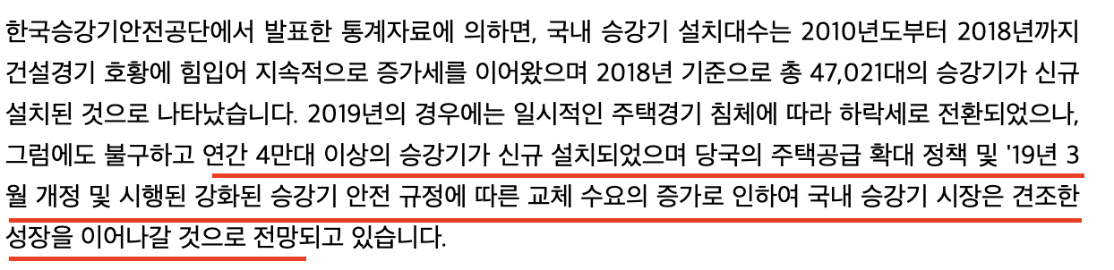 ⊙ 뿐만 아니라 앞으로도 승강기용 감속기 시장(국내 승강기 시장)은 견조한 성장을 이어갈 것으로 기대된다고 합니다.