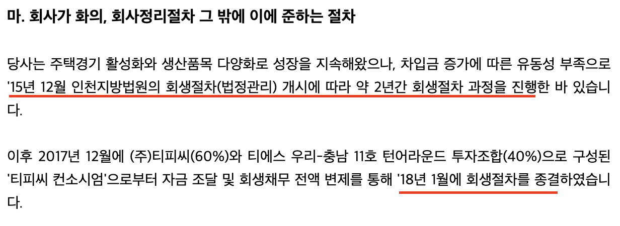 ⊙ 투자설명서를 살펴보니, '해성티피씨'는 2016년부터 2년간 회생절차를 진행한 독특한 이력이 있었습니다. (올해 공모주 투자를 하면서 기업의 투자설명서를 계속해서 보고 있는데, 처음으로 보는 '회생절차'라서 눈에 띄는 것 같습니다.) 단순 참고만 하시면 되겠습니다.