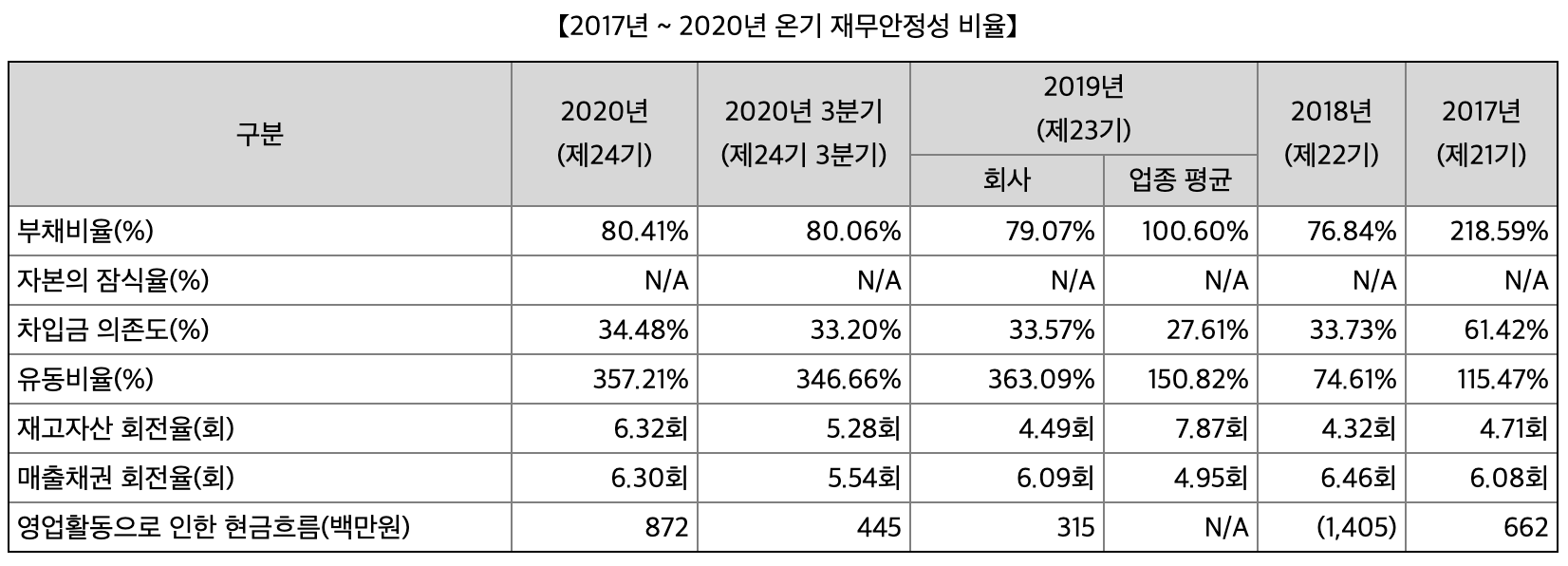 3) 재무안정성 수치를 보면 업종 평균보다 좋거나(부채비율), 다소 열위에 있는(차입금 의존도, 유동비율) 것을 알 수 있으나, 분석기관의 평가에 따르면 재무안정성은 대체로 양호하며, 재무안정성 등의 위협받을 가능성은 낮을 것으로 예상된다고 합니다.