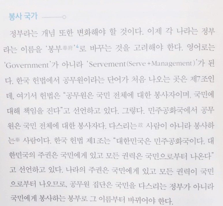 (*다양한 사람들의 창의적인 아이디어를 국가 시책에 접목하고 반영할 수 있다면, 더 적은 예산으로 더 많은 효과를 창출할 수 있고, 이것이 저자가 말한 '봉사 국가'로 나갈 수 있는 지름길이 될 수 있을 것 같다는 생각을 하게 되었습니다.)