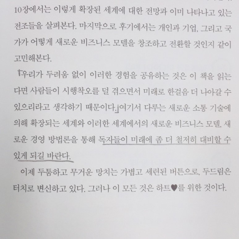 다시 말해, 이 책은 ('IT 분야'나 기획·개발 업무에 종사하는 분들에게만 도움을 주는 책이 아니라,) 아무런 연관성이 없는 일을 하고 있는 저에게도 앞으로 다가올 미래에 대해서 생각해보고, 나의 업무에 다양한 아이디어를 접목할 수 있고, 생각에 날개를 달아줄 수 있는 흥미롭고 많은 도움을 주는 책이었습니다.