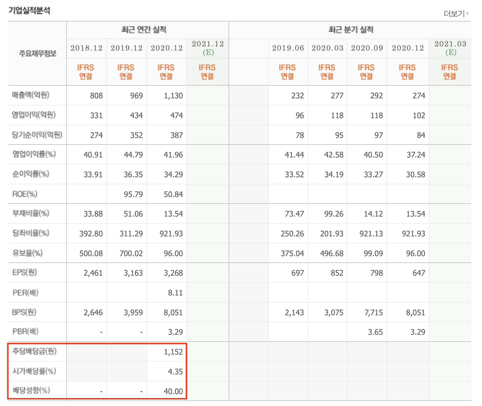 ▣ '모바일 게임 기업'으로 동일 업종과 비교해볼 때 매우 좋은 재무실적을 보여주는 회사 그리고 배당금을 많이 주는(시가배당률 4.35% / 배당성향 40%) 회사