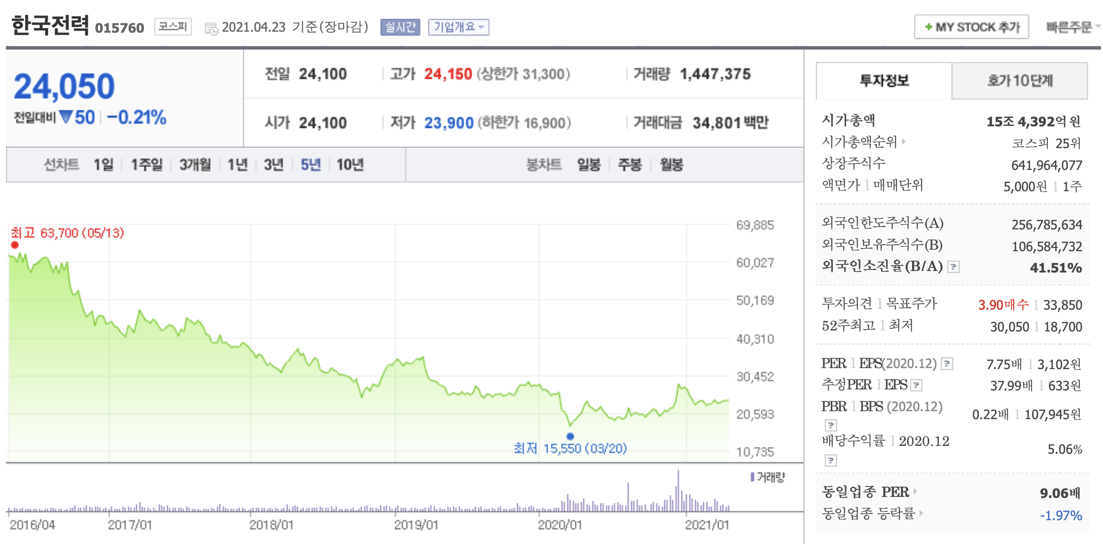 ▣ 그리고 "한국전력"을 보면 "우량주를 장기투자"하라는 것에 대해서 다시 생각해보게 되는 것 같습니다.