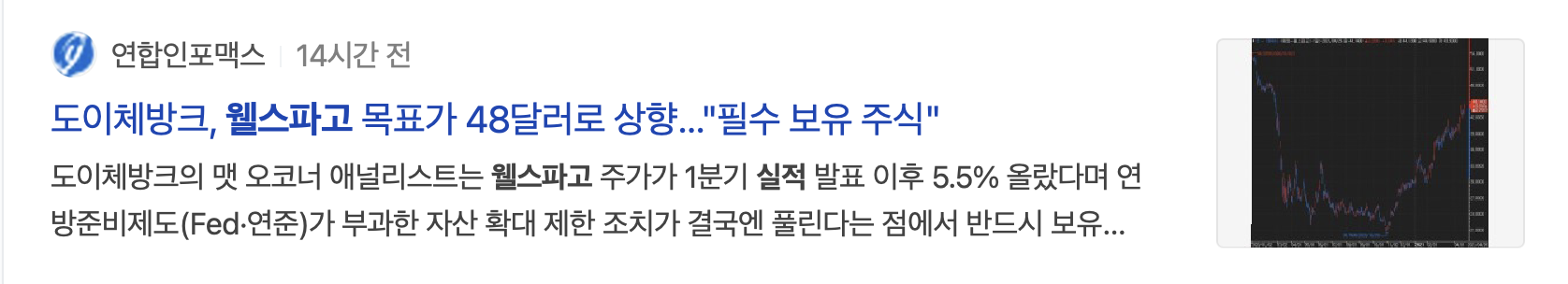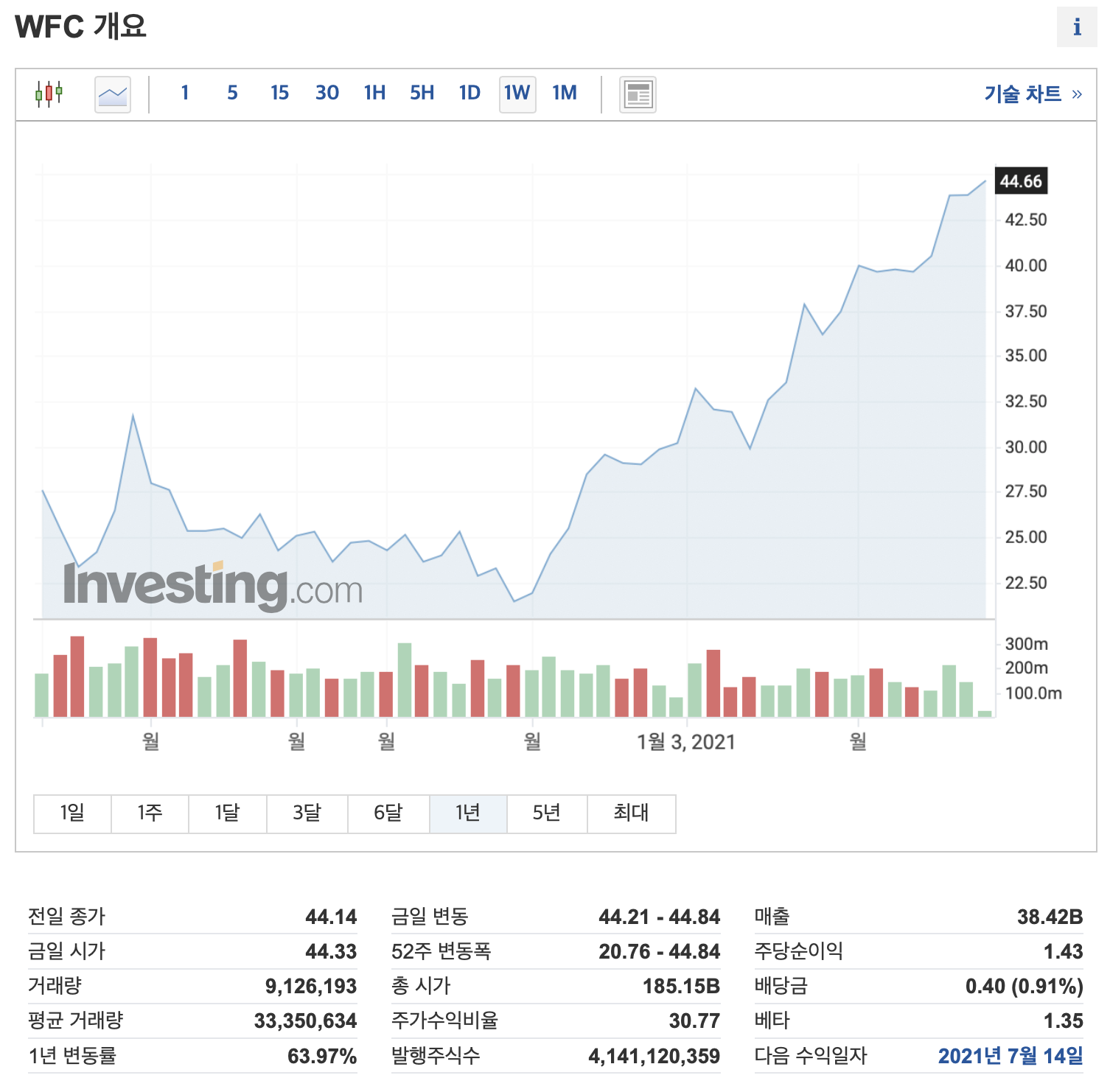 ⊙ '웰스파고'는 제가 미국 주식 투자 초기에 얼마 되지 않은 투자금으로 집중 매수를 했었는데, 연일 좋지 않은 기사와 지지부진한 주가로 인해서 저의 관심에서 멀어졌는데, 요즈음 급등한 주가를 보면, 저의 선택에 아쉬움이 많이 남는 것 같습니다.