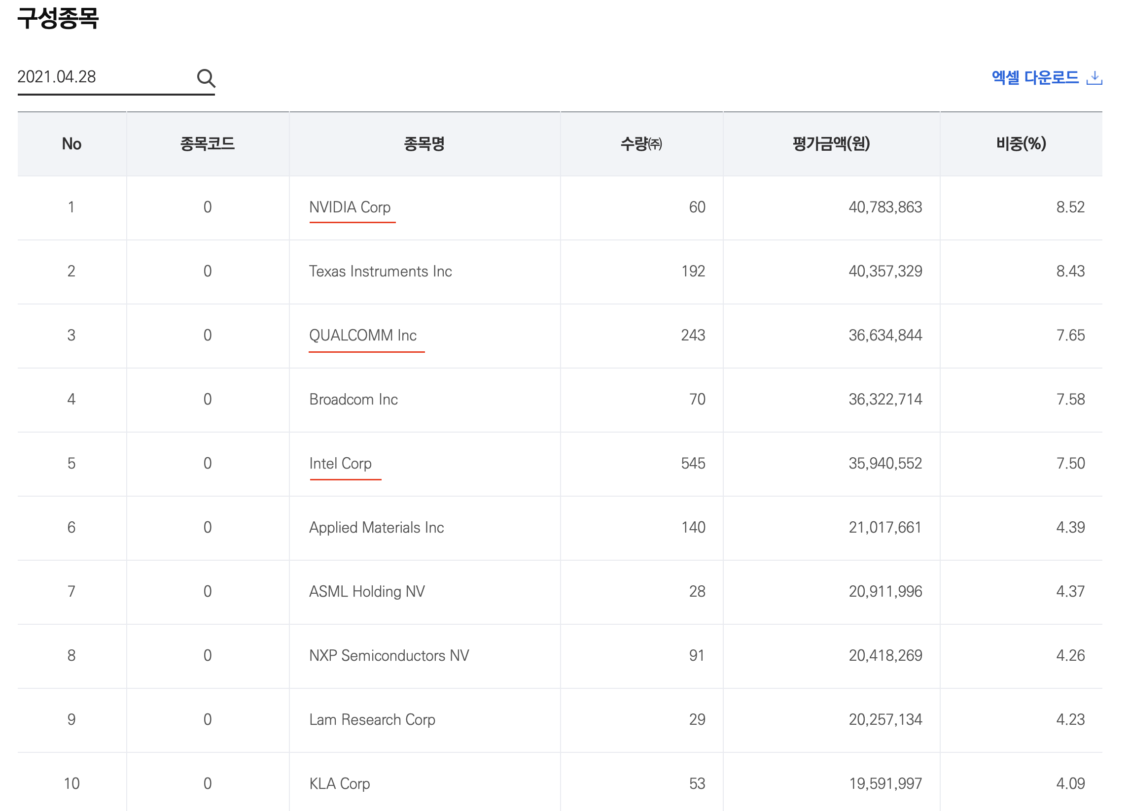 ⊙ 제가 투자하고 있는 "ETF"는 이번 달에 미래에셋증권에서 신규로 출시한 "TIGER 미국필라델피아반도체나스닥 ETF"로 인텔뿐만 아니라, nvidia와 같은 '글로벌 반도체 밸류체인 전반'에 투자를 하고 있습니다.