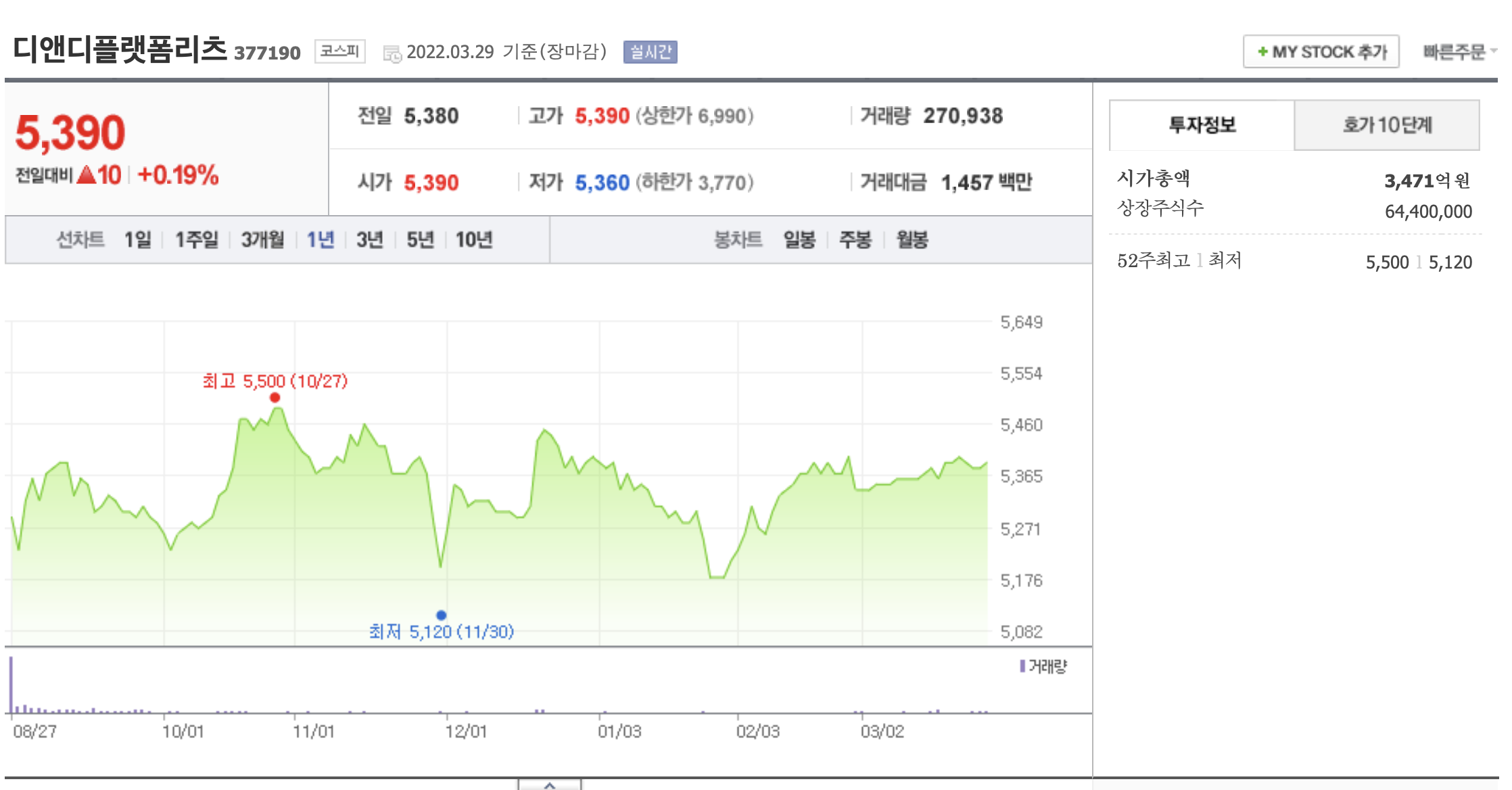 디앤디플랫폼리츠는 상장 후 큰 주가 상승 없이 5,300원 정도에서 아래위로 주가가 조금씩 움직이는 것 같습니다.