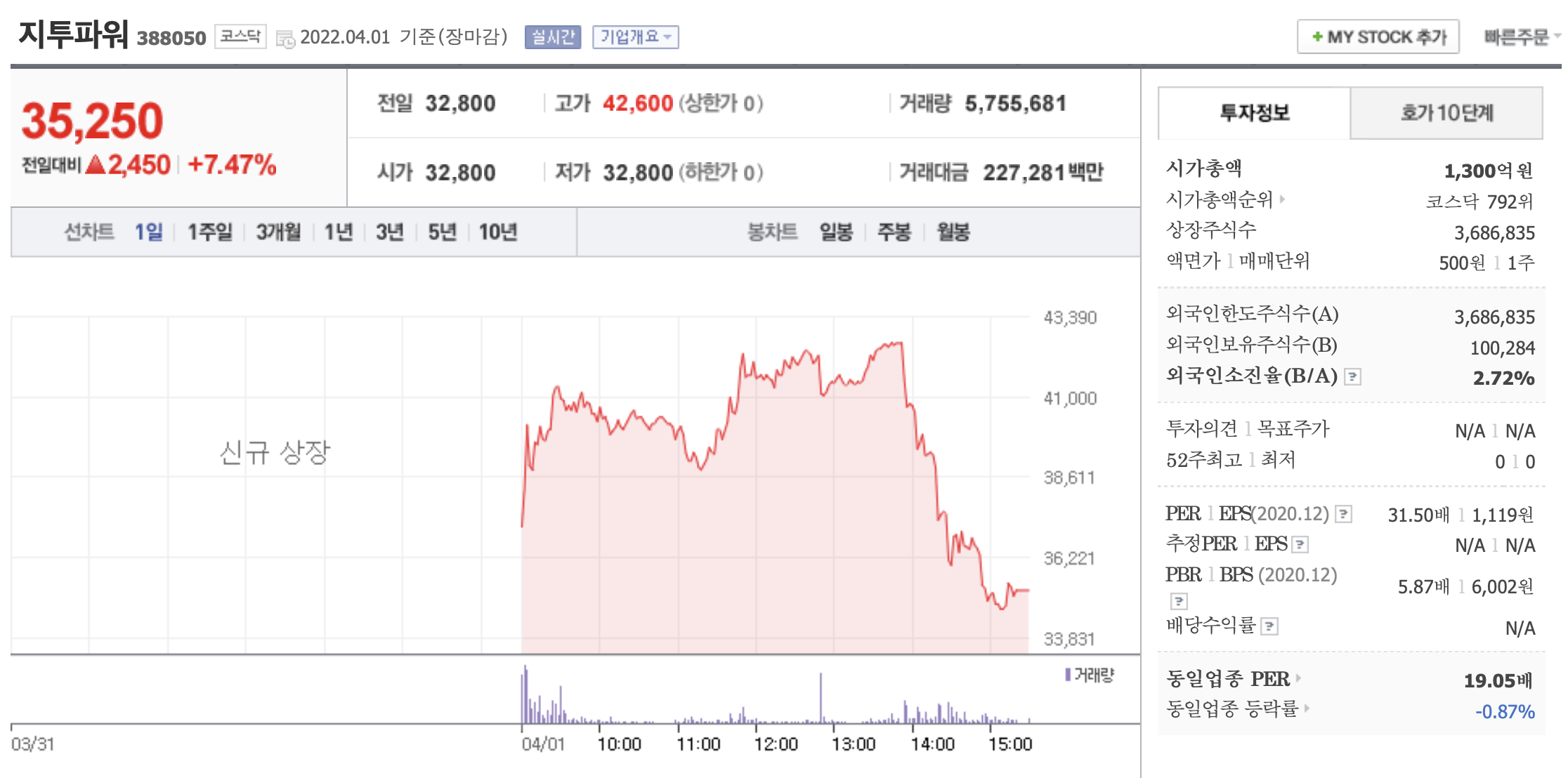 - 오늘은 지난 3월 말에 공모 진행하였던, '지투파워'가 상장하는 날이어서, 아침에 주식 호가창을 살펴보다가 기대 이상으로 주가가 많이 상승하였기에 큰 욕심을 내지 않고 바로 매도했습니다.
