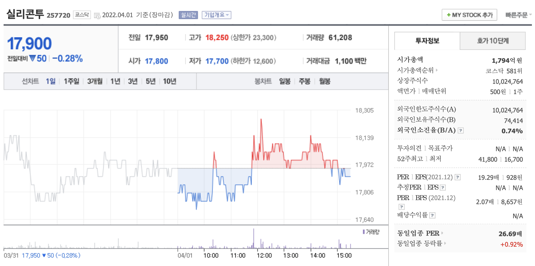 - 배정받은 공모주는 특별히 장기보유해야겠다고 생각하지 않는 경우 대부분 당일 오전에 매도하고 있는데, 작년 9월에 배정받은 '실리콘투'는 상장 당일 매도를 하지 못했었는데, 그 뒤로 계속 주가가 하락하여 어느새 17,900원까지(2022. 4. 1. 종가)까지 하락하였습니다. 어쩔수 없이 장기투자를 하고 있는 종목이 되었는데,그래서 앞으로 주가가 회복하길 기다릴지, 아니면 손절해야할 지 고민이 되는 것 같습니다.