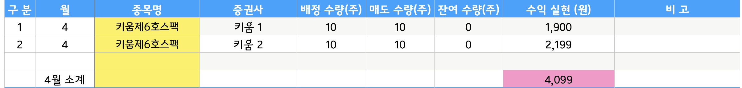 저는 균등 배정받았던, 키움제6호스팩 20주를 매도해서 너무나 감사하게도 4,099원의 소중한 수익이 발생했습니다. 소중한 투자수익은 현재 집중해서 매수하고 있는 리츠 종목 투자에 활용해야할 것 같습니다.