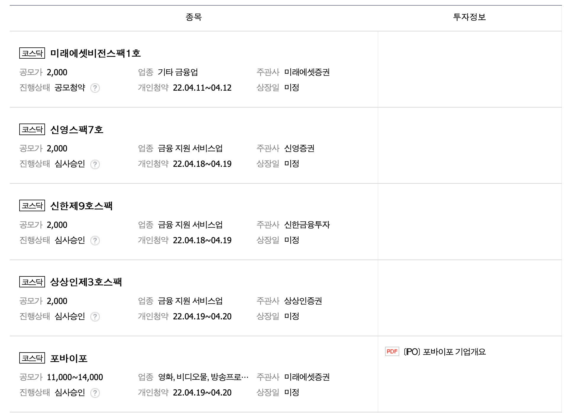 남은 4월 일정 중에 4개의 스팩이 추가로 상장할 예정이기 때문에 개인적으로는 잘 고민하고 청약을 해야할 것 같습니다.