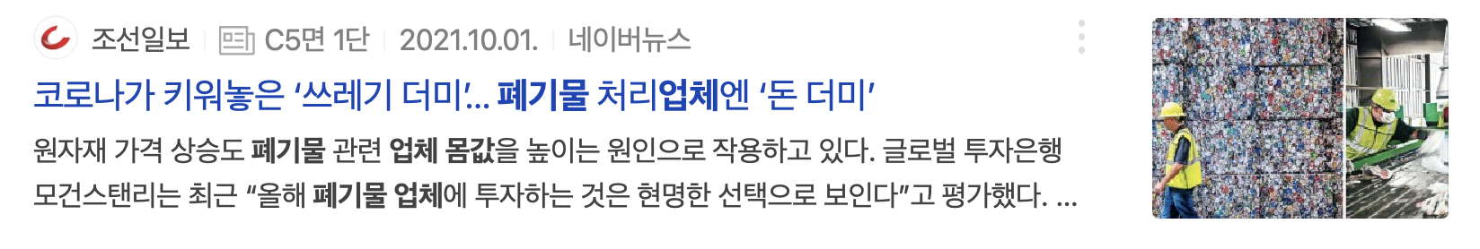 아마도 코로나와 관련해서 '폐기물 업체'가 시장에서 많은 주목을 받게 되던 때부터 저도 폐기물업체인 코엔텍에 많은 관심을 갖게 된 것 같습니다.