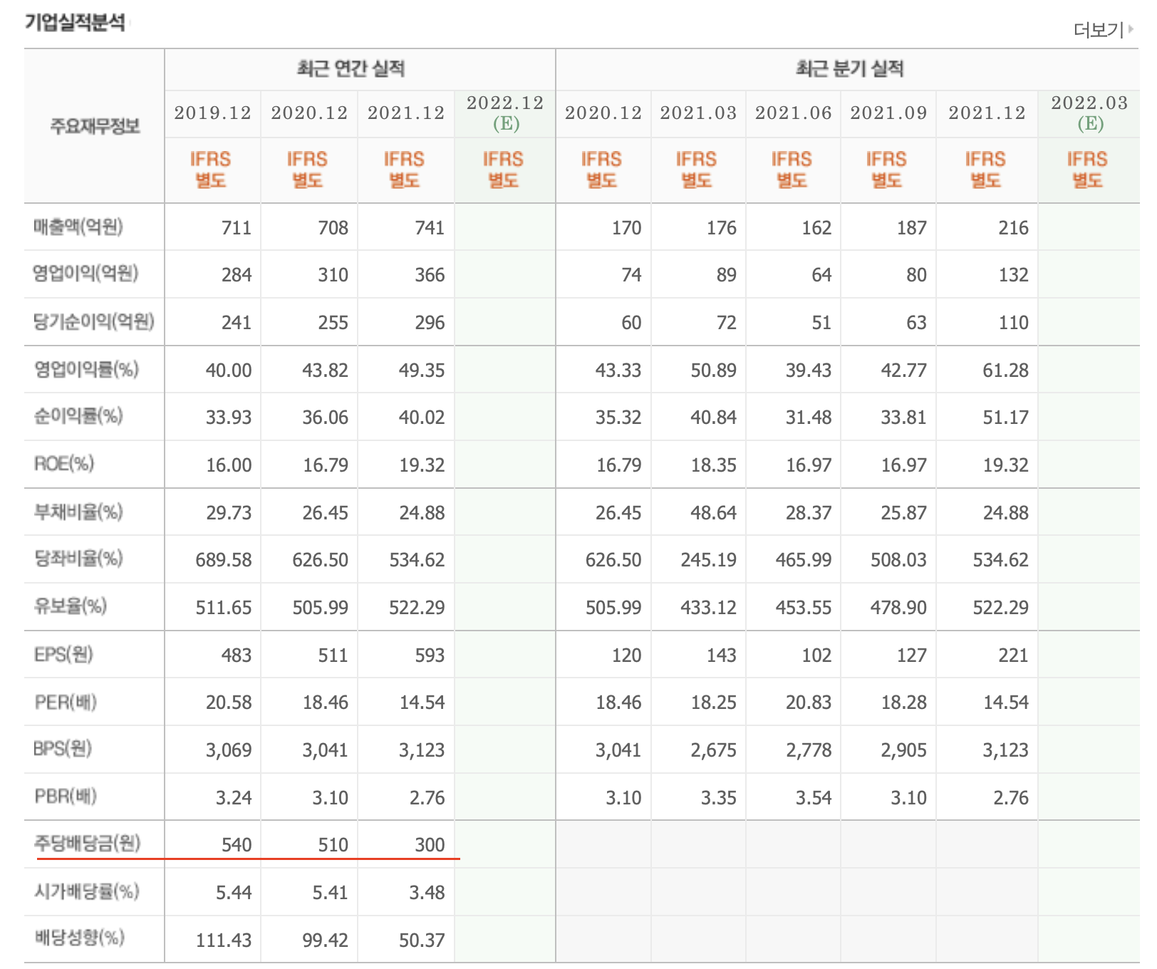 * 직전 연도와 비교했을 때 영업이익과 순이익이 증가했음에도 2021년 배당금이 많이 줄어서 조금 아쉬운 것 같습니다.