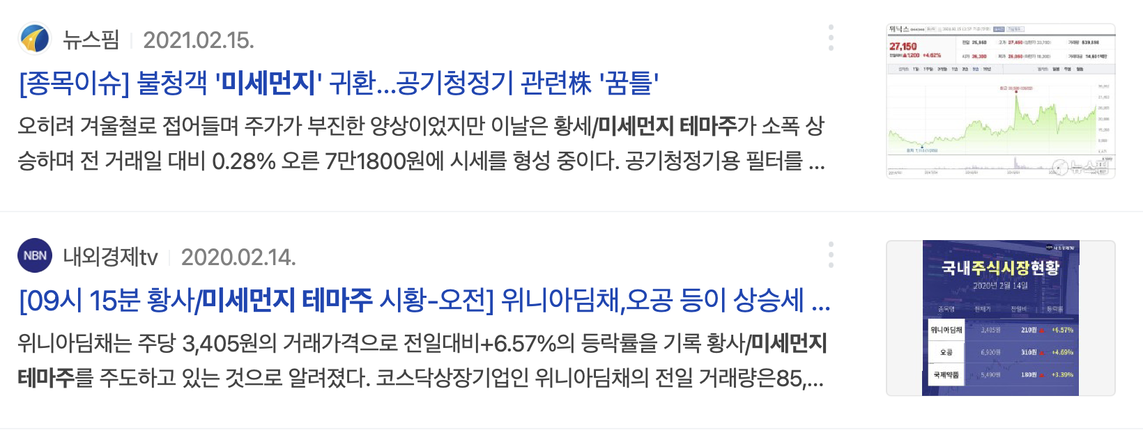 4. 뉴스 기사를 살펴보면, 2020년, 2021년에는 그나마 미세먼지, 황사 관련 테마주 관련 언론 보도 내용을 살펴볼 수 있었는데, 올해는 이마저도 너무나 잠잠한 것 같아서, 소액 주주로서 안타까운 것 같습니다.