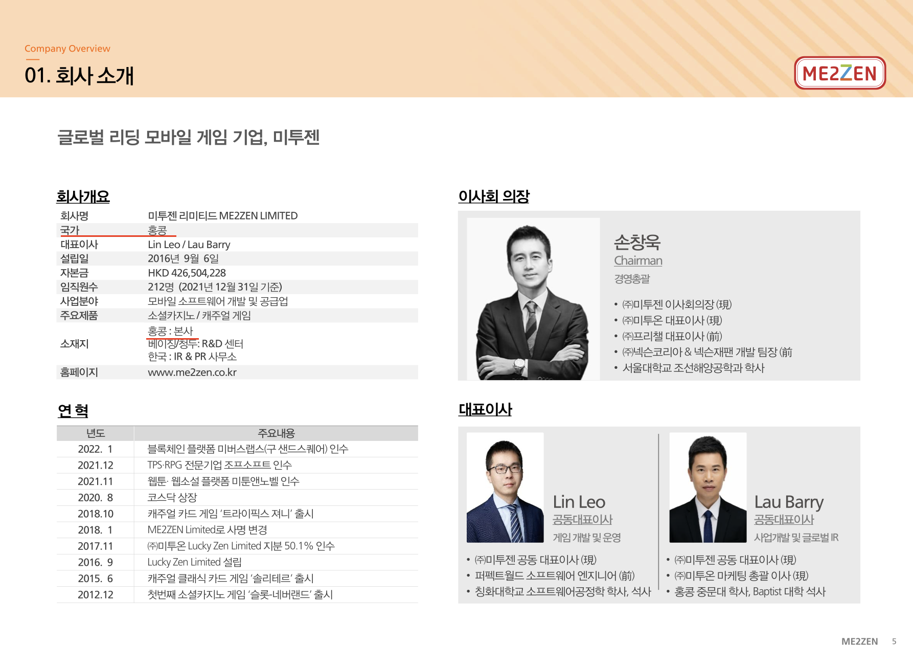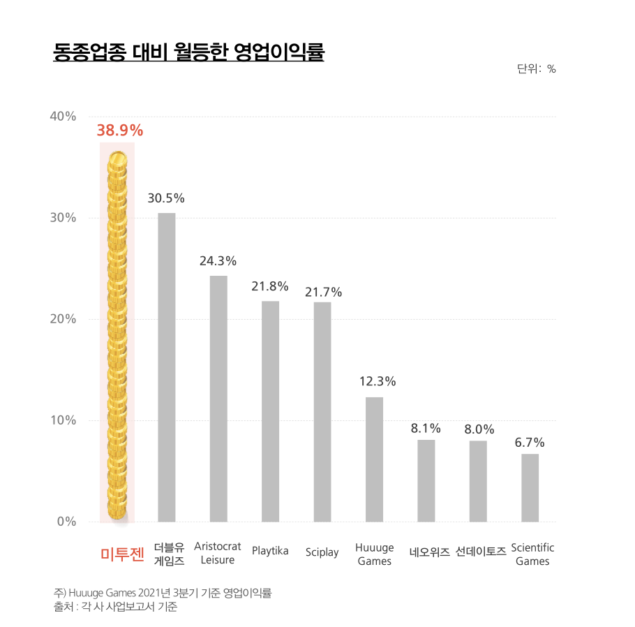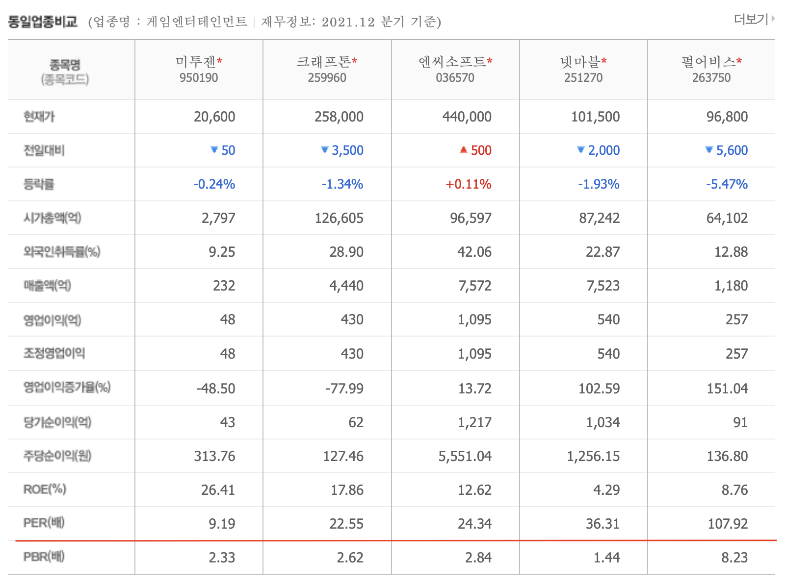 6. 미투젠이 엄청난 영업이익률을 만들어 내고 (2021년 기준 38.86%) 있고, 매우 낮은 부채비율(2021년 기준 9.61%)이라는 점은 분명하지만, 그래도 상대적으로 국내 다른 게임종목과 비교할 때 주가 상승의 모멘텀이 약하고, 중국기업 리스크가 있다는 점에서 계속해서 '미투젠'을 보유해야 할지 고민이 많아지는 것 같습니다.