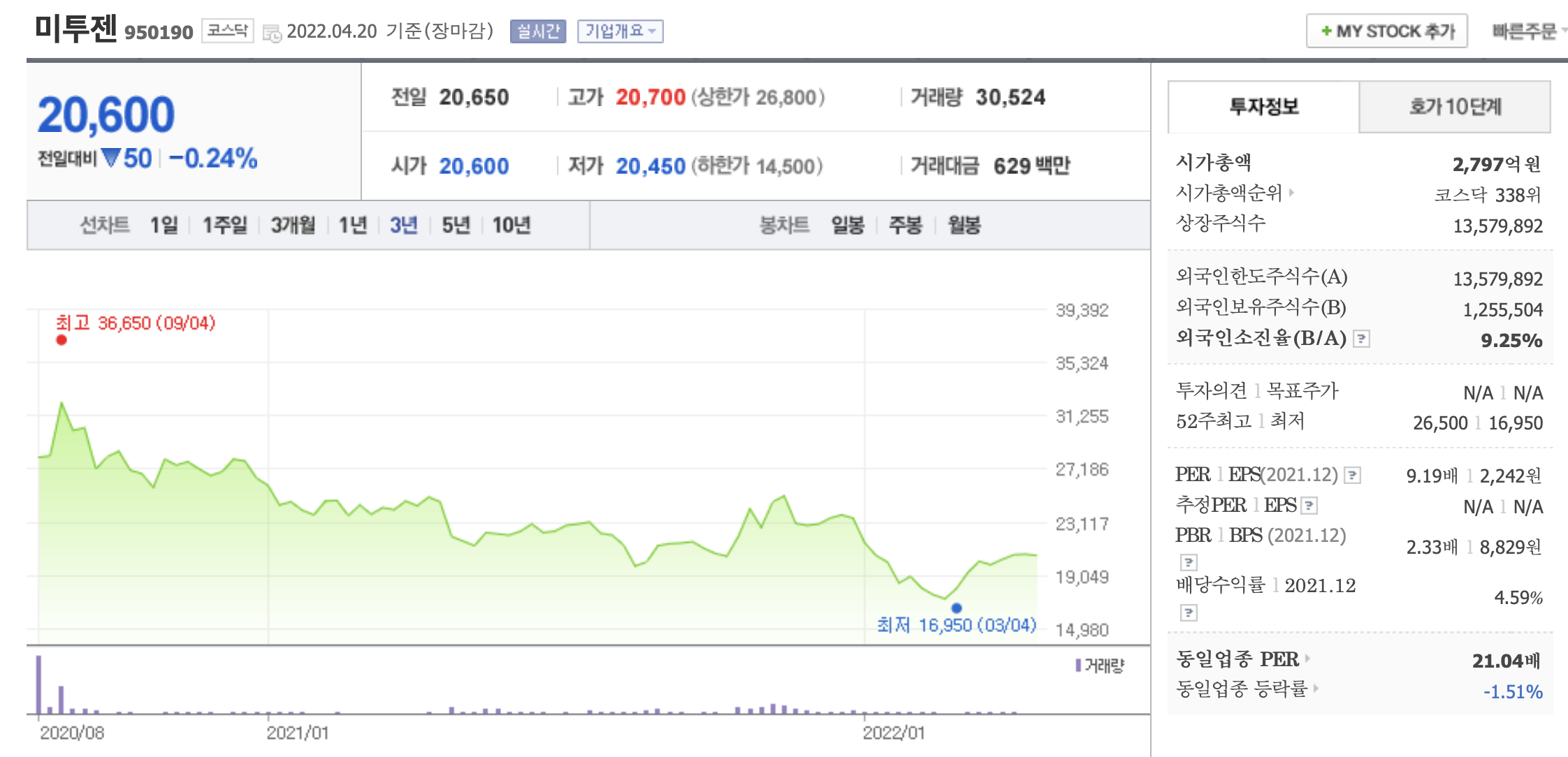 5. 그나마 다행스러운 것이, 상장한 2020년, 2021년 모두 당기순이익의 40%를 배당금으로 지급하면서(2020년 배당금 1,152원 / 2021년 배당금 945원) 시가 배당률이 4%가 넘는 배당금을 주주들에게 나눠주고 있어서, 주가에서 손실이 발생했더라도, 그나마 주가가 다시 오를 것을 기대하면서, 보유주식을 팔지 않고 버틸 수 있는 힘이 되는 것 같습니다. 저 역시 '미투젠'이 제가 매수한 평단가보다, 현재 주가가 많이 빠져있지만, 다시 반등할 날을 기다리면서 보유 중인 종목 중 하나인 것 같습니다.