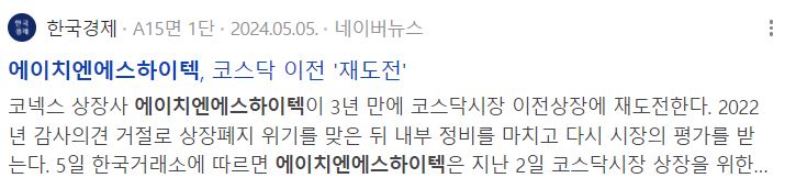 에이치엔에스하이텍은 1995년에 설립된 전자 부품 제조업체로, ACF(이방성전도필름)와 수정 진동기를 전문으로 하고 있는데, 코넥스에서 코스닥으로 이전 상장하는 것인데, 이를 통해 더 큰 자본을 조달하고 생산 시설 확장 및 연구 개발에 투자할 계획인 것 같습니다.