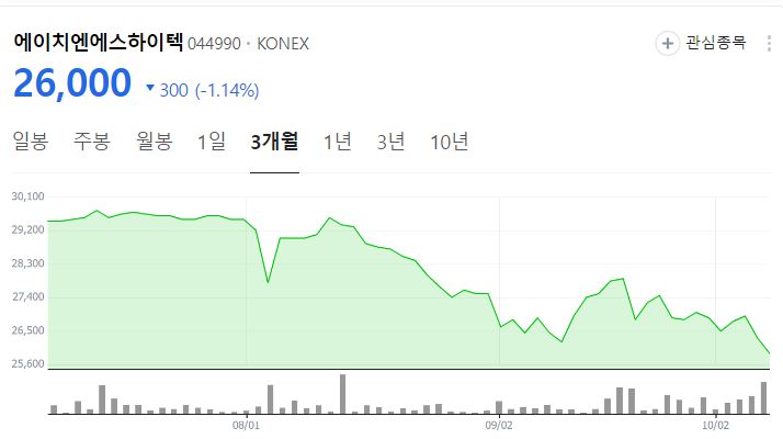 아래 그래프는 에이치엔에스하이텍의 최근 3개월 주가 변동 추이를 보여줍니다. (주가 흐름은 좋지 않은 것 같습니다.)