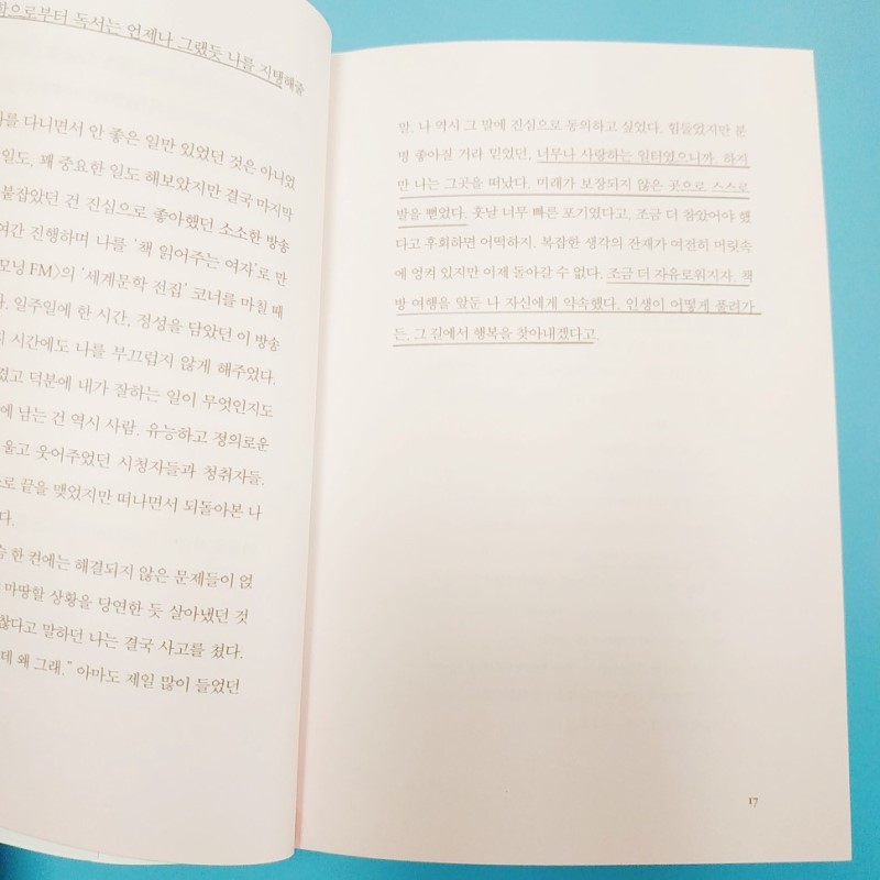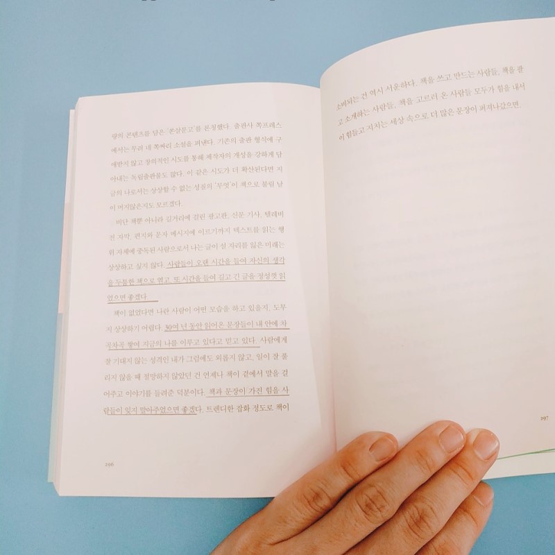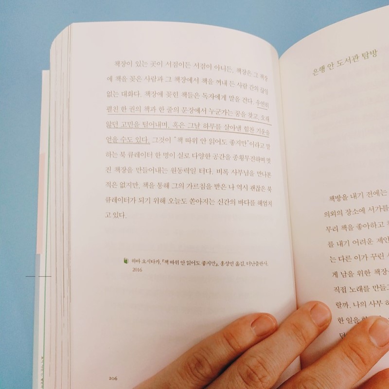 우연히 펼친 한 권의 책과 한 줄의 문장에서 누군가는 꿈을 찾고, 오래 앓던 고민을 털어내며, 혹은 그날 하루를 살아낼 힘찬 기운을 얻을 수도 있다.(P.206)