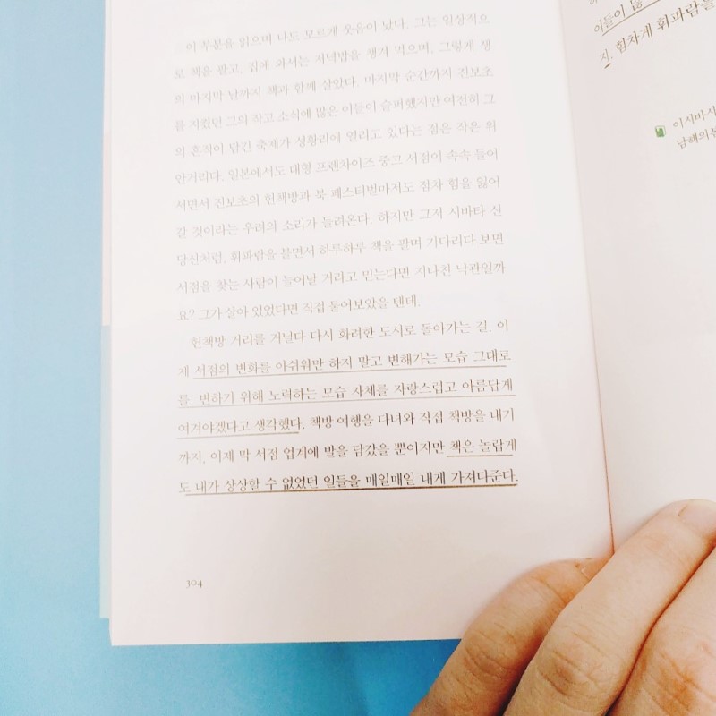 이 책은 「저자가 30여 년 동안 읽어온 문장들에 또 다른 색깔을 입힌 따뜻한 느낌」 이 많이 묻어있는 책이라는 생각이 많이 들었습니다. 어떻게 보면, 이 책은 일본 (책방) 여행기로도 손색없는 글이지만, 여기에 그치지 않고 한 발짝 전진해서 저자의 마음이 보이는 책이었습니다.