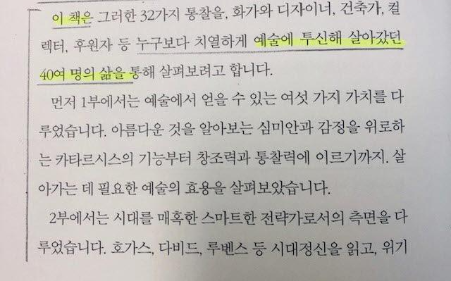 (*개인적으로 ‘3부 예술은 어떻게 브랜드가 되는가’, ‘4부 어디까지 예술이 될 수 있을까’라는 챕터는 저자님이 독자에게 던져주고자 하는 메시지가 ‘너무 많은 작품, 작가에 대한 설명으로 인해’ 조금은 희석된, 그래서 ‘예술의 쓸모’에 대해 독자들이 깊이 있는 고민에 이르기에는 ‘조금은 부족하지 않은가’라는 생각이 들었습니다./ 흥미로운 이야기였지만 ‘삶의 통찰과 더 넓은 시야’를 배우기에게는 주제별 분량이 조금은 부족했던 것 같습니다.)