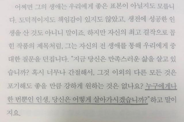 ◎ 예술은 우리가 좀 더 넓은 시야를 가지도록 도와주고, 얼어붙은 삶의 감각을 깨워주기 때문에 우리에게 필요합니다.