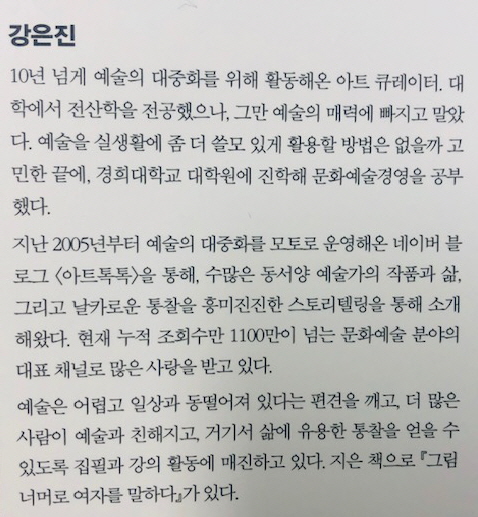 지은이 강은진. 수많은 동서양 예술가의 작품과 삶 그리고 날카로운 통찰을 흥미진진한 스토리텔링을 통해 소개하고 있다고 합니다.