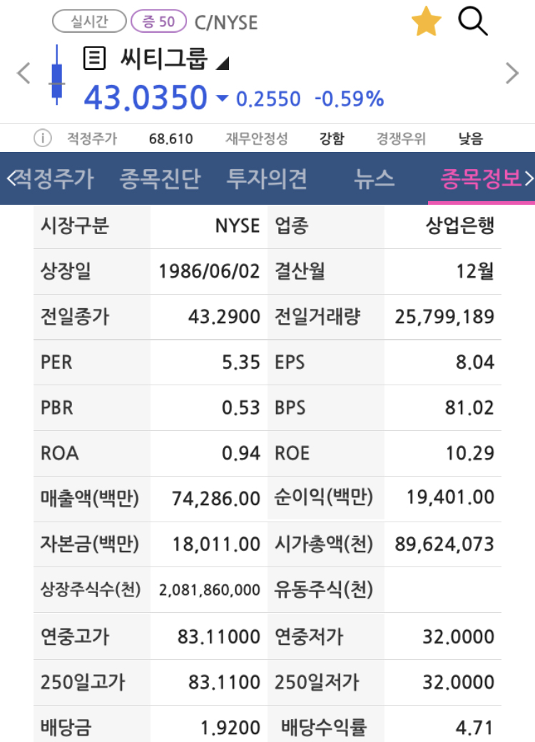 (*국내증시 시가총액 1위 삼성전자 약 349조, 2위 sk하이닉스가 60조 정도 된다는 점을 감안해볼 때 '씨티그룹의 규모'를 가늠해보시면 될 것 같습니다.)