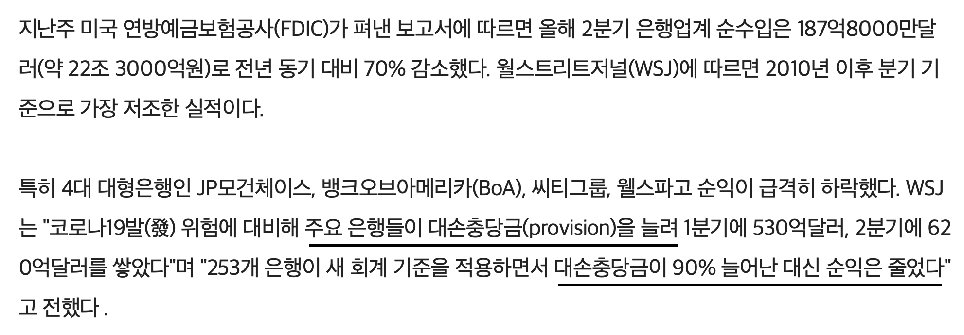 ◎ 특히 이런 순이익 급감의 원인은 은행의 주입원 중 하나인 예금 이자와 대출 이자 간 차이(예대 마진)가 역대급으로 낮아진 상태이며, 대출자가 원리금을 제대로 갚지 못한 결우 발생할 법적 손실을 미리 계산해서 쌓아두는 '대손충당금'이 급격하게 증가되었기 때문이라고 합니다.