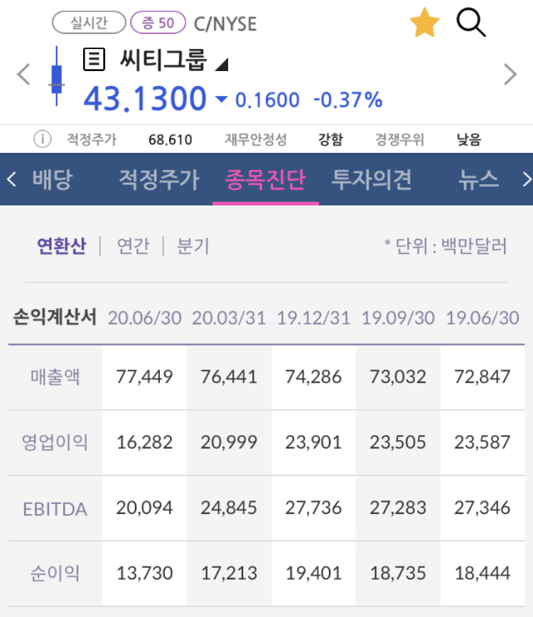 ◎ '씨티그룹' 역시 코로나19 영향으로 매출액이 줄고 순이익이 급감했습니다. 그래서 주가 역시 크게 떨어졌습니다.