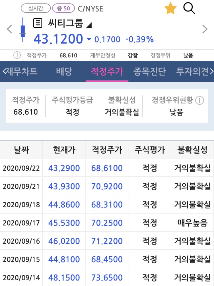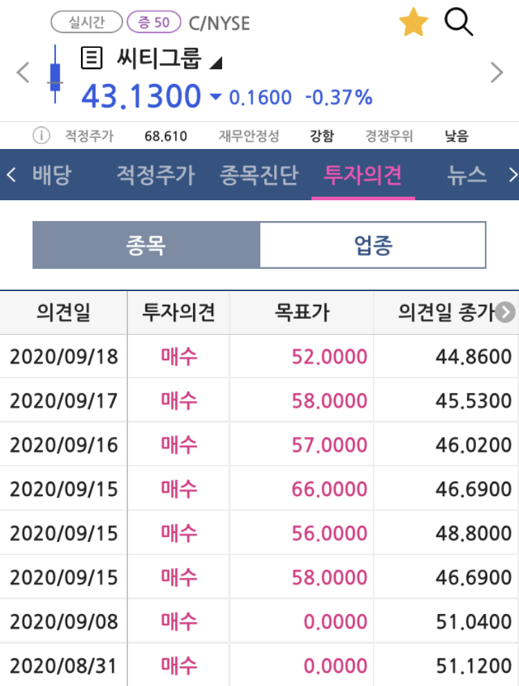 ◎ 코로나 19로 인해서 올해 들어 씨티그룹의 주가는 약 36% 정도 하락하는 등 씨티그룹을 비롯한 많은 미국 금융주가 어려움을 겪고 있는 것이 사실이나, 코로나 19 백신, 치료제가 출시되면, 경기민감주인 금융주도 반등될 수 있다고 합니다.