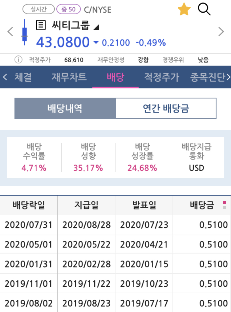 ◎ 물론, 가장 최근(2020년 2/4분기) 순이익이 13억 달러로 전년 같은 기간보다 순이익이 급감하였고 코로나 19로 불확실성이 높아져서 주가 반등까지는 아직은 많은 시간이 걸릴 수도 있겠지만, 장기 투자의 관점과 주가가 급락함에 따라 주가 대비 배당 수익인 배당수익률이 높아져 (*9. 24. 기준 약 4.71%) 적은 돈이지만, 나만의 포트폴리오에 소량 매수해보았습니다.