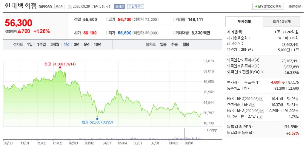 ◎ 현대백화점 52주 신저가 : 52,600원 / 2020. 9. 29. 종가 : 56,300원