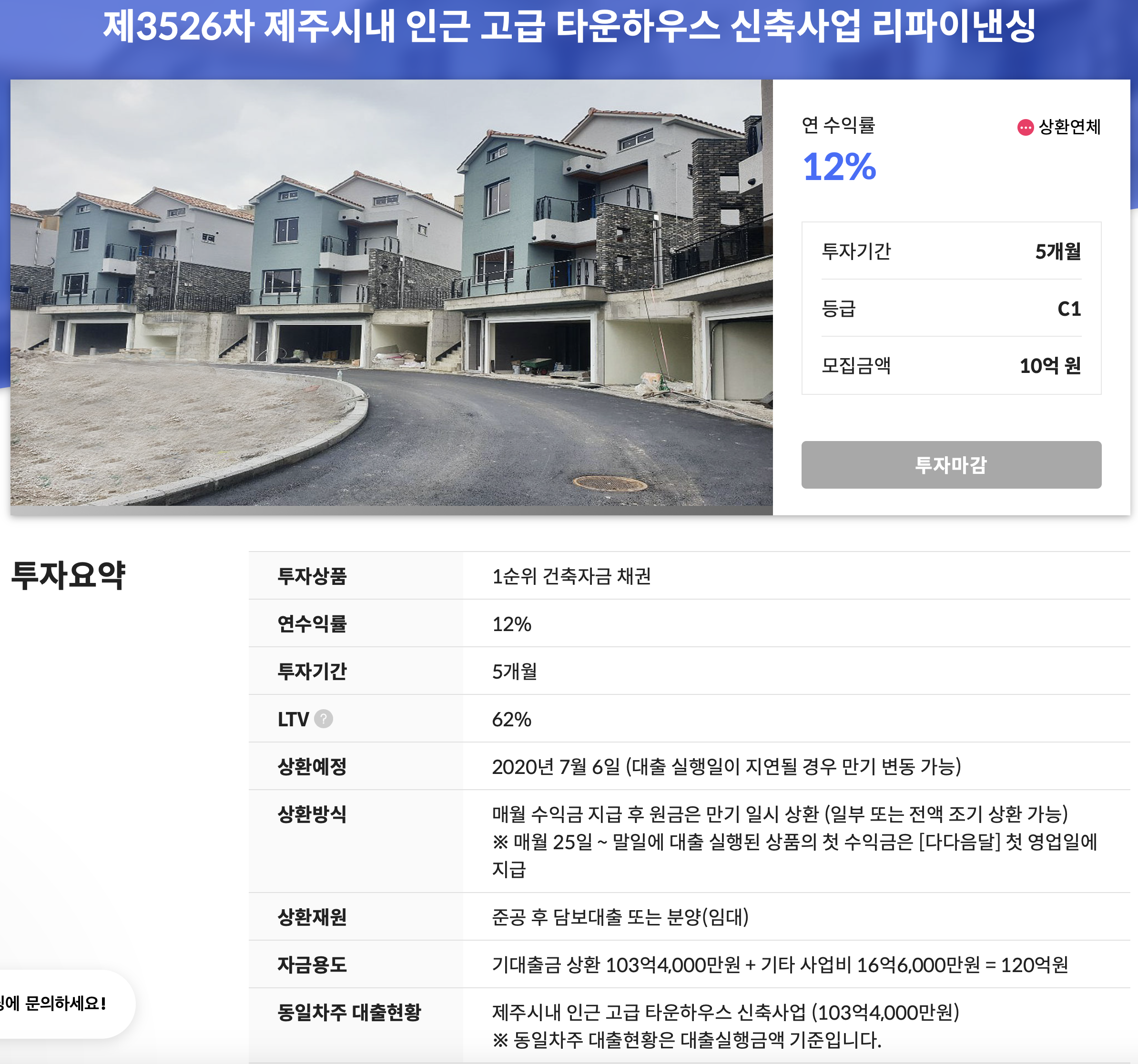 1. 저는 제주시내 인근 고급 타운하우스 신축사업 리파이낸싱 상품에 투자했습니다.