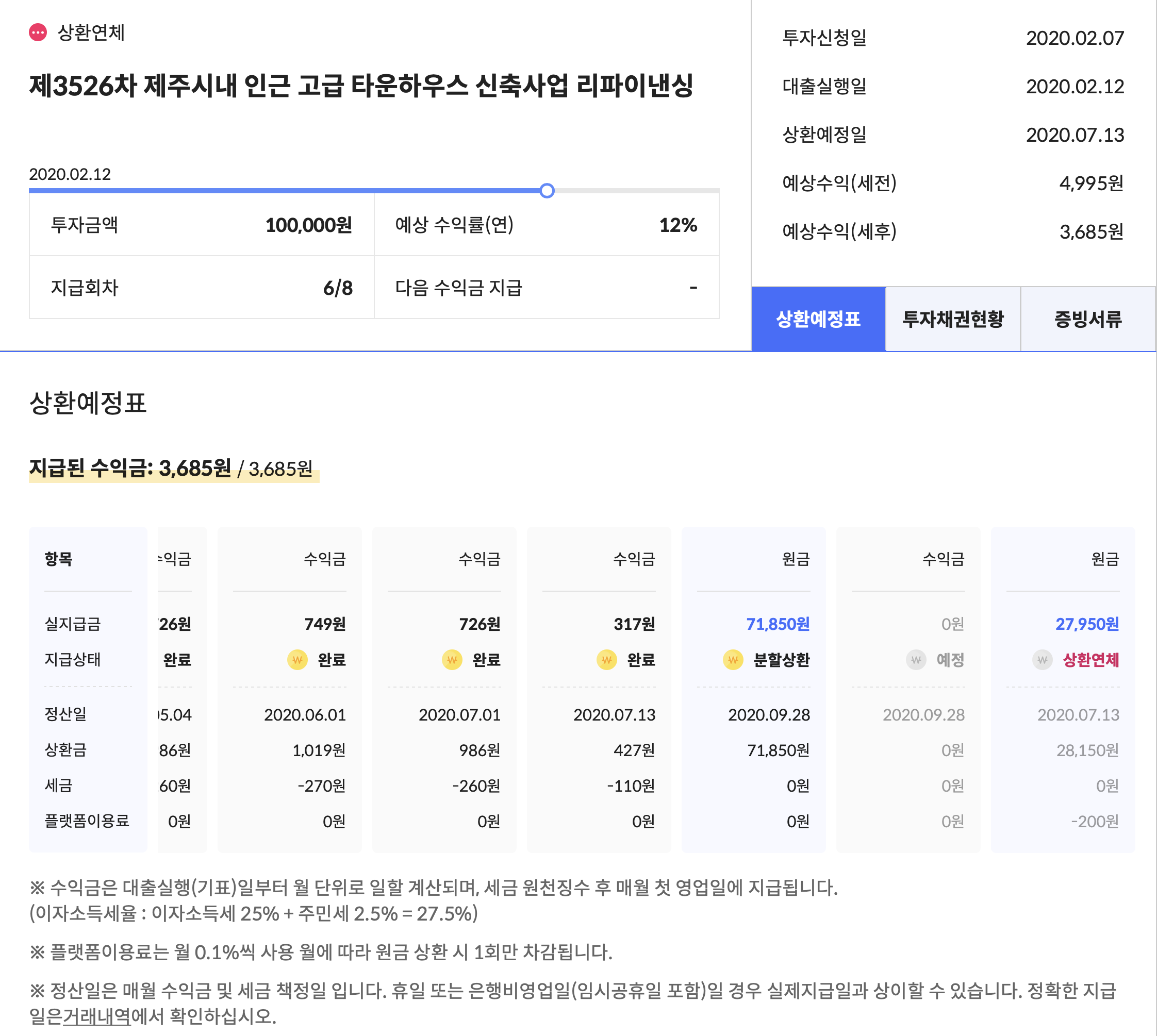 ▶ 2020. 10. 3. (현재) : 투자금 100,000원 중 총 85,535원을 상환 (현재 기준 수익률 -15%)