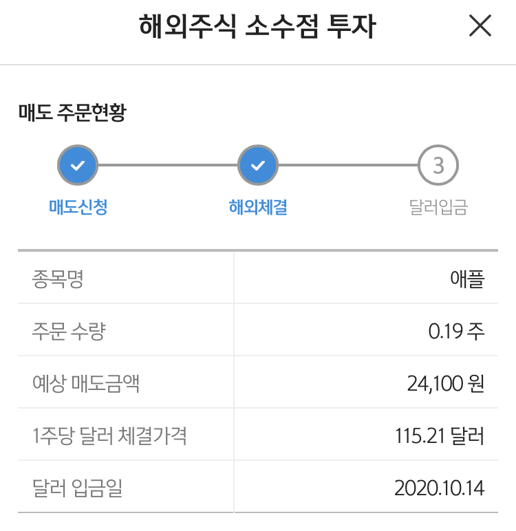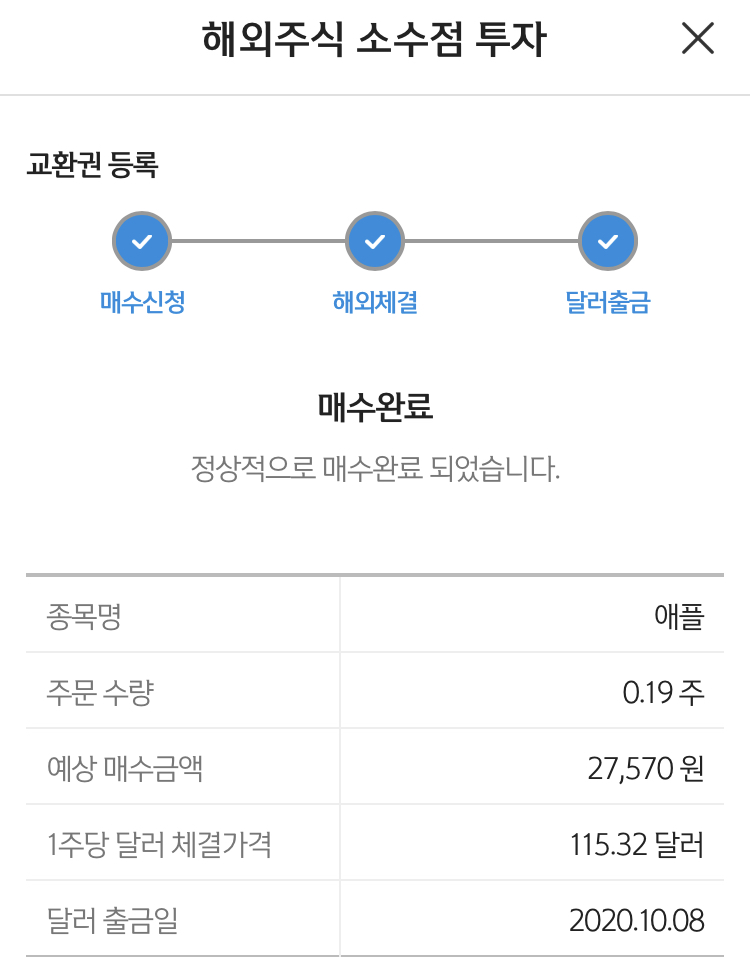 4. '교환권'으로 제가 선택한 애플 주식을 소수점 매수해보았습니다.